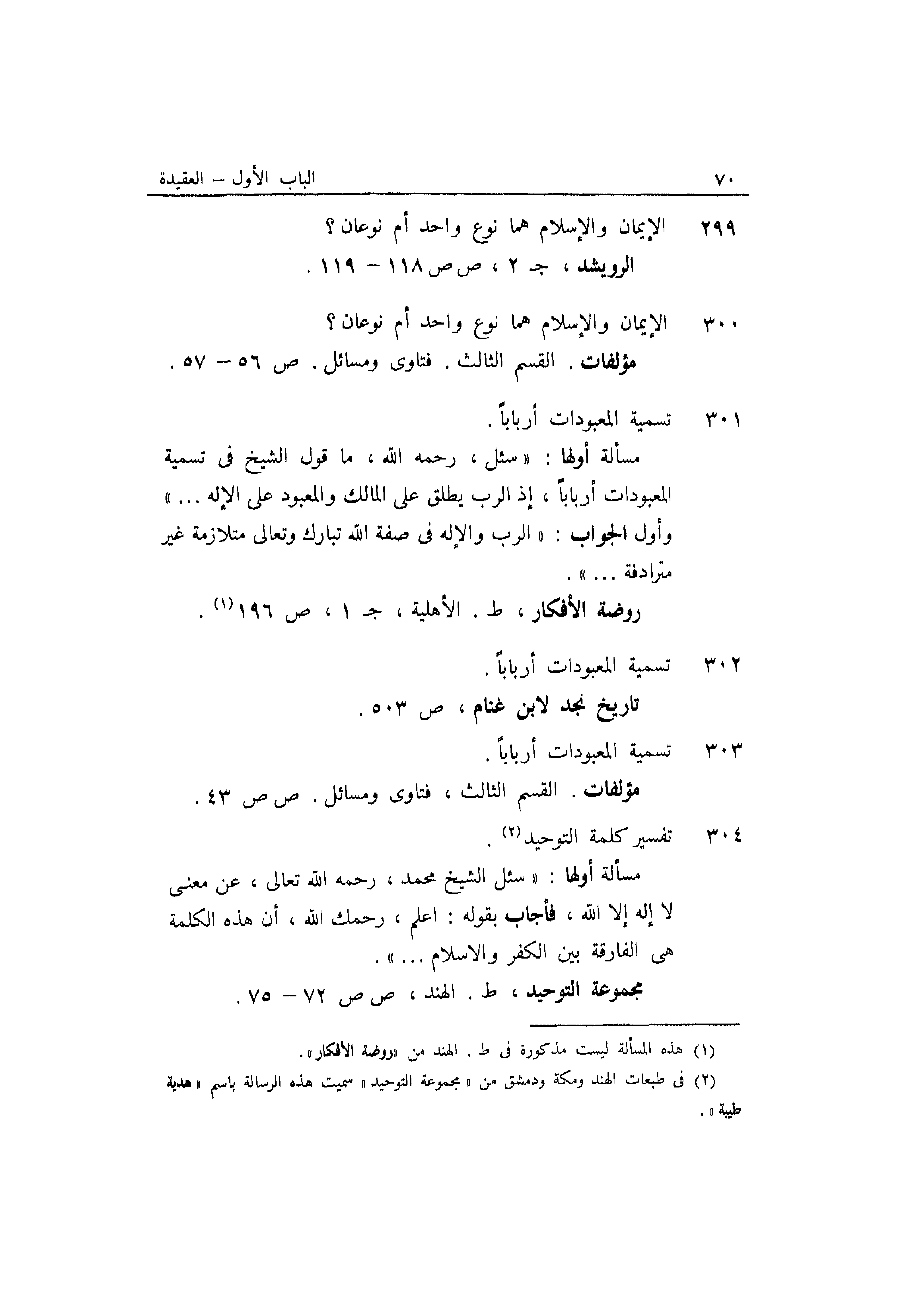 مسألة أولها: "سئل رحمه الله ما قول الشيخ في تسمية المعبودات أربابا، إذ الرب يطلق على المالك والمعبود على الإله ... ". وأول الجواب: "الرب والإله في صفة الله تبارك وتعالى متلازمة غير مترادفة ... ".