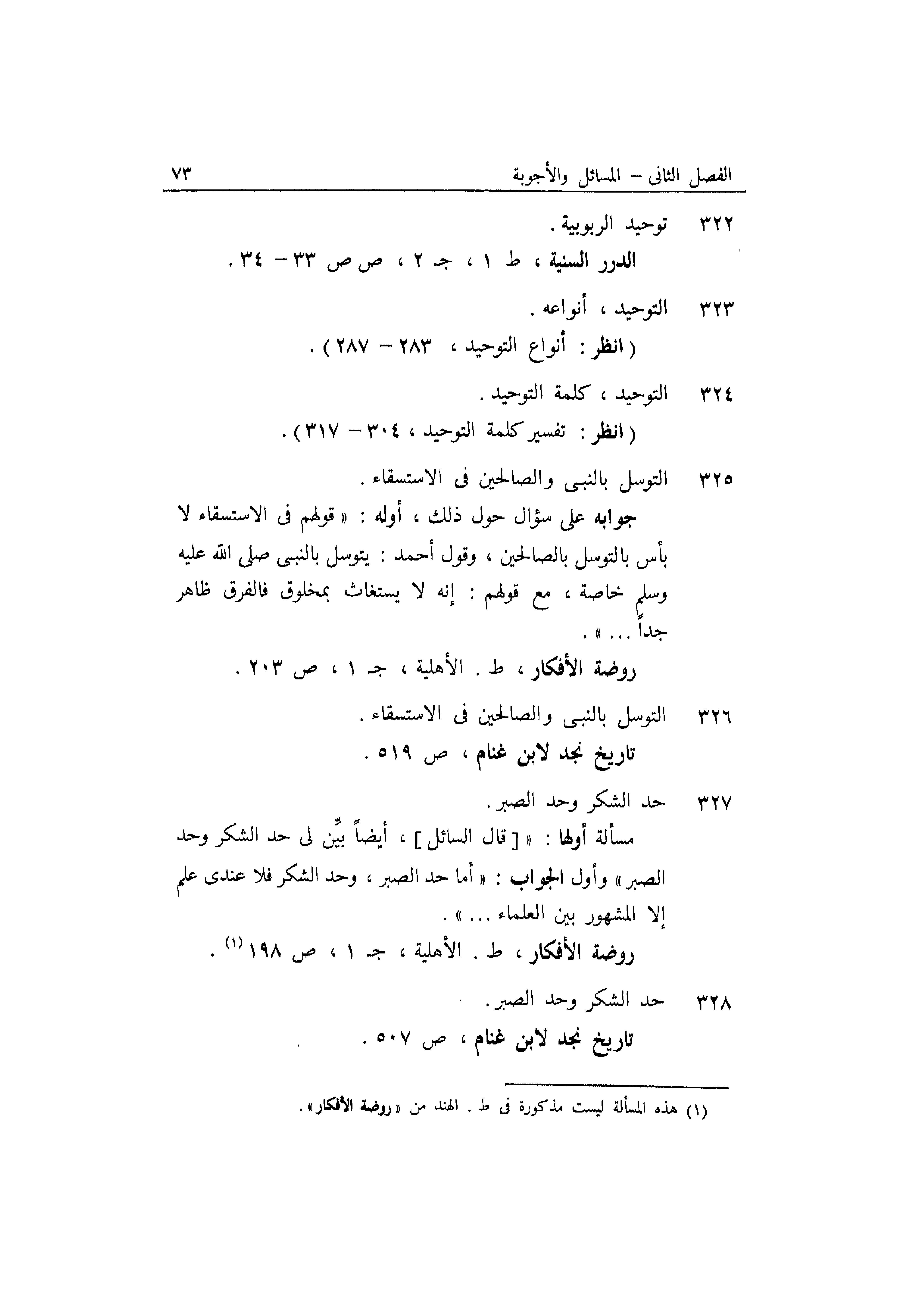 مسألة أولها: " [قال السائل] ، أيضاً بين لي حد الشكر وحد الصبر" وأول الجواب: "أما حد الصبر، وحد الشكر فلا عندي علم إلا المشهور بين العلماء ... ".