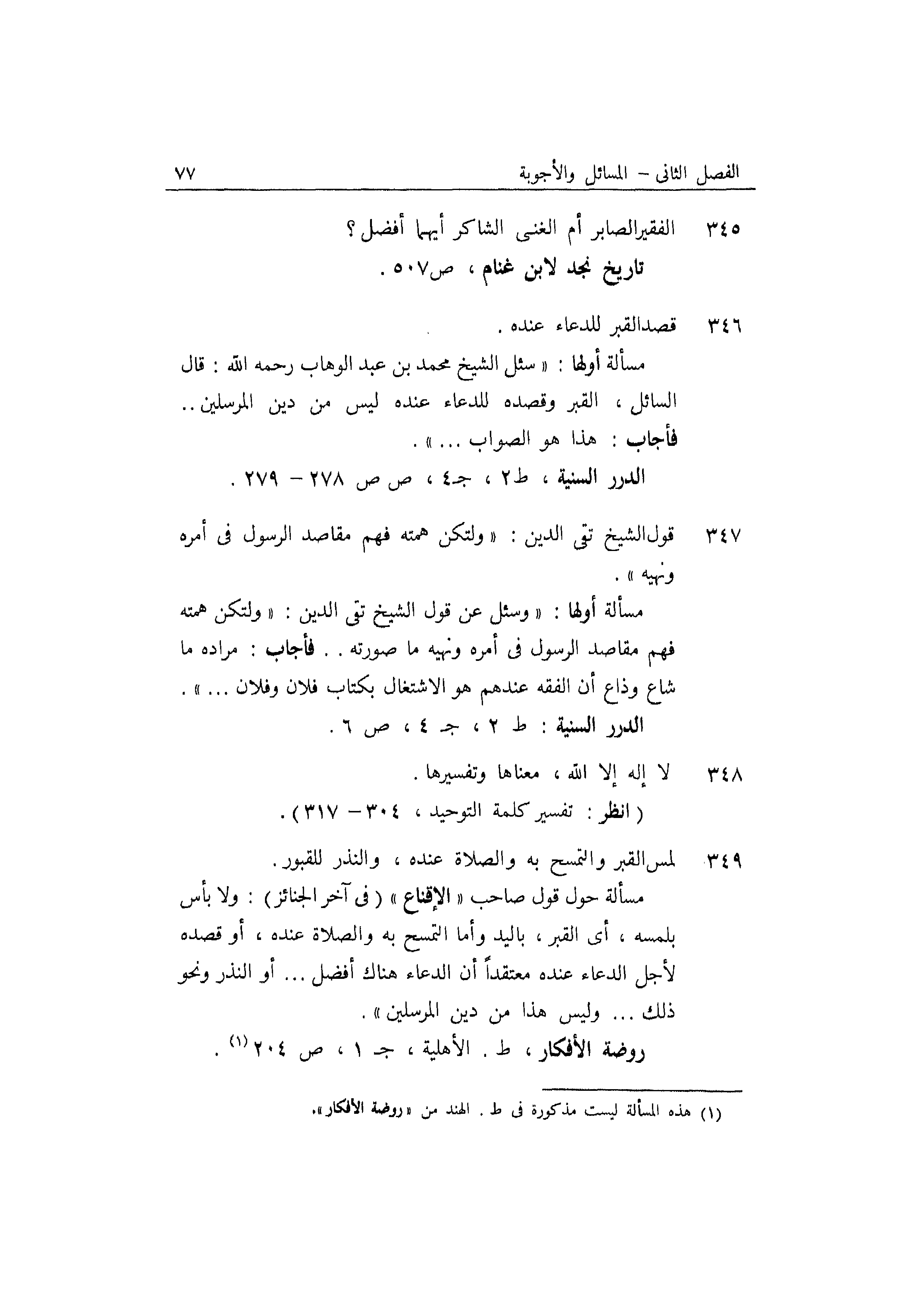 مسألة أولها: "سئل الشيخ محمد بن عبد الوهاب رحمه الله: قال السائل، القبر وقصده للدعاء عنده ليس من دين المرسلين ... فأجاب: هذا هو الصواب ... ".