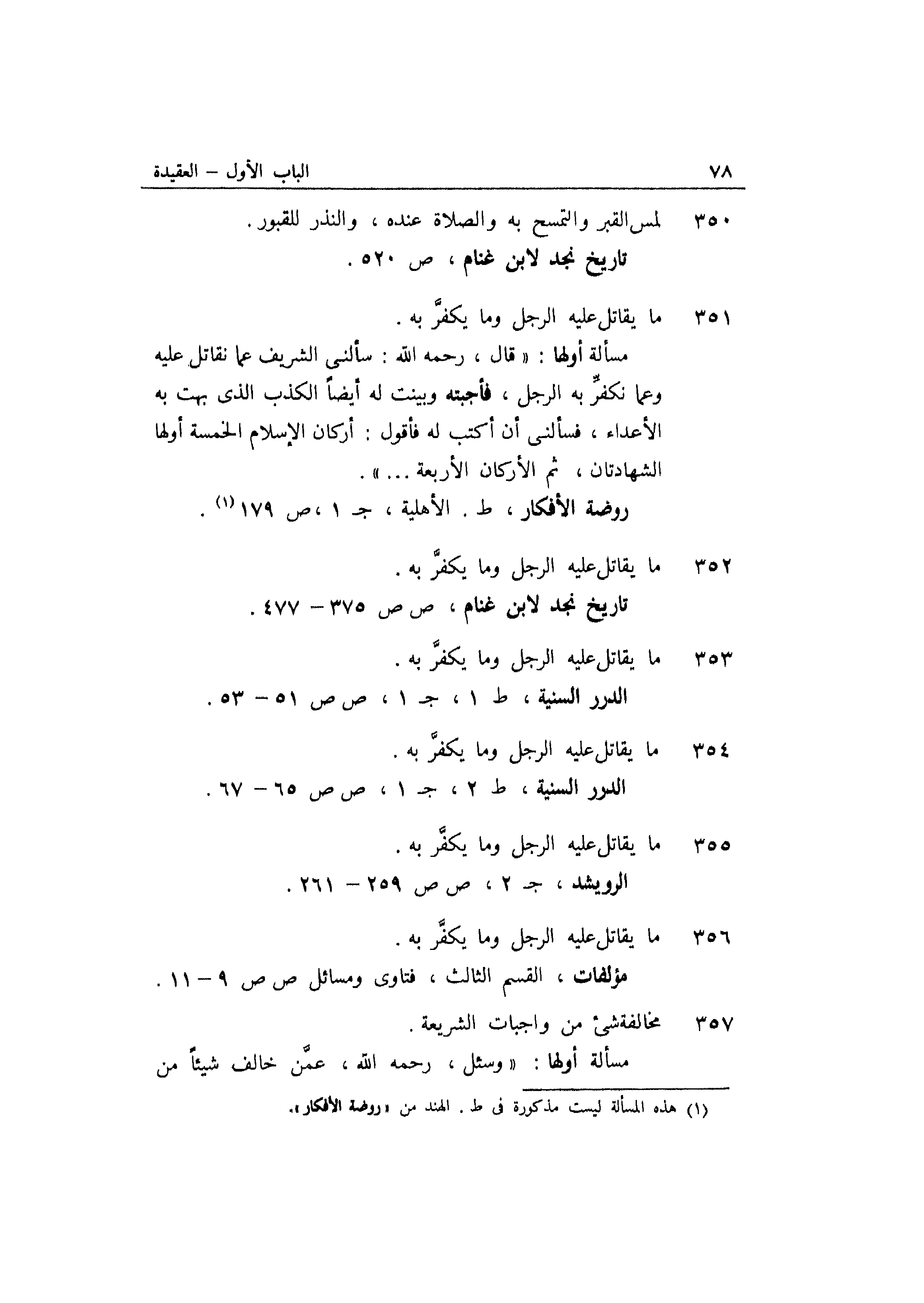 مسألة أولها: "قال رحمه الله: سألني الشريف عما نقاتل عليه وعما نكفر به الرجل، فأجبته وبينت له أيضاً الكذب الذي بهت به الأعداء، فسألني أن أكتب له فأقول: أركان الإسلام الخمسة أولها الشهادتان، ثم الأركان الأربعة ... ".