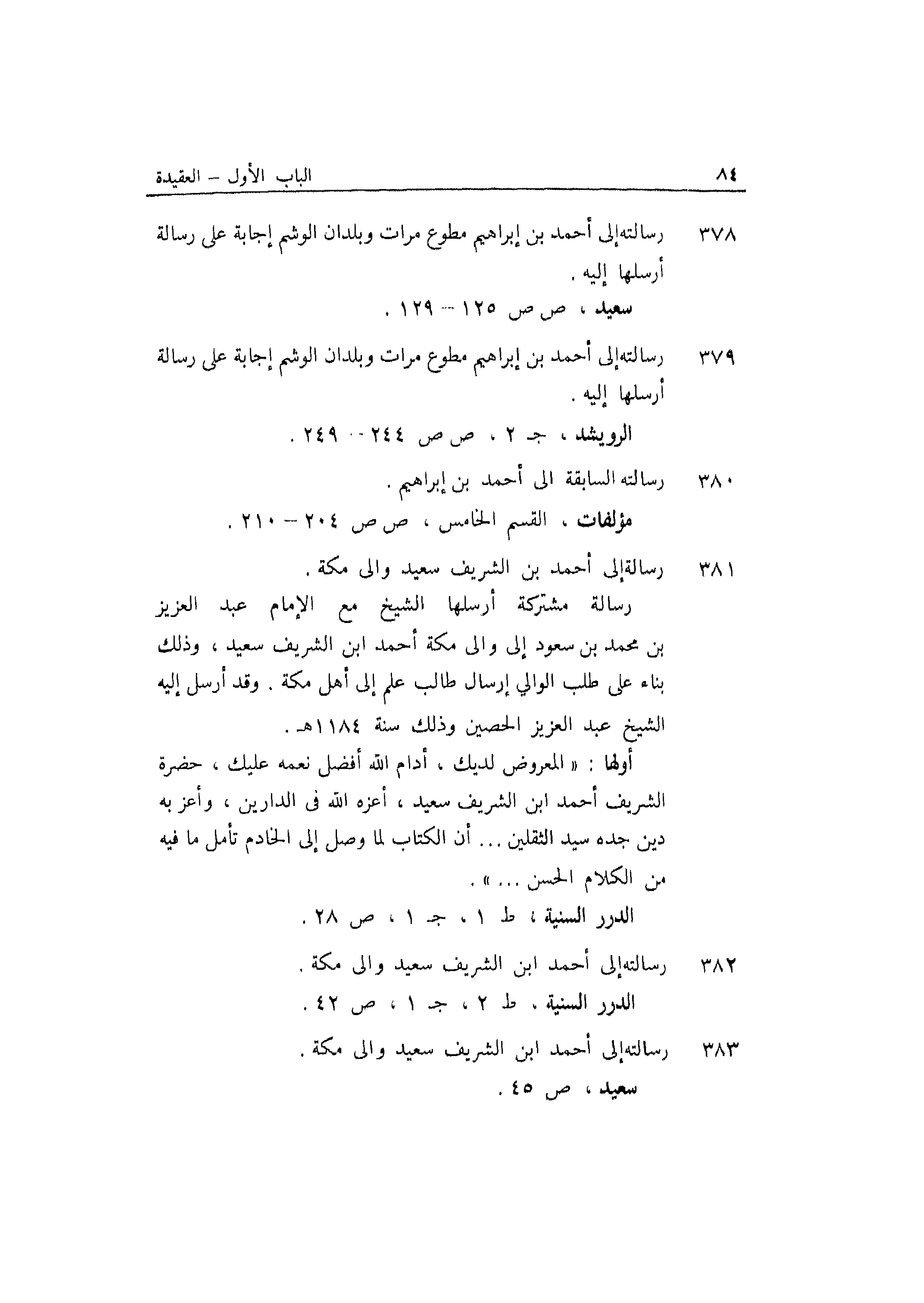 378 رسالته إلى أحمد بن إبراهيم مطوع مرات وبلدان الوشم إجابة على رسالة أرسلها إليه.