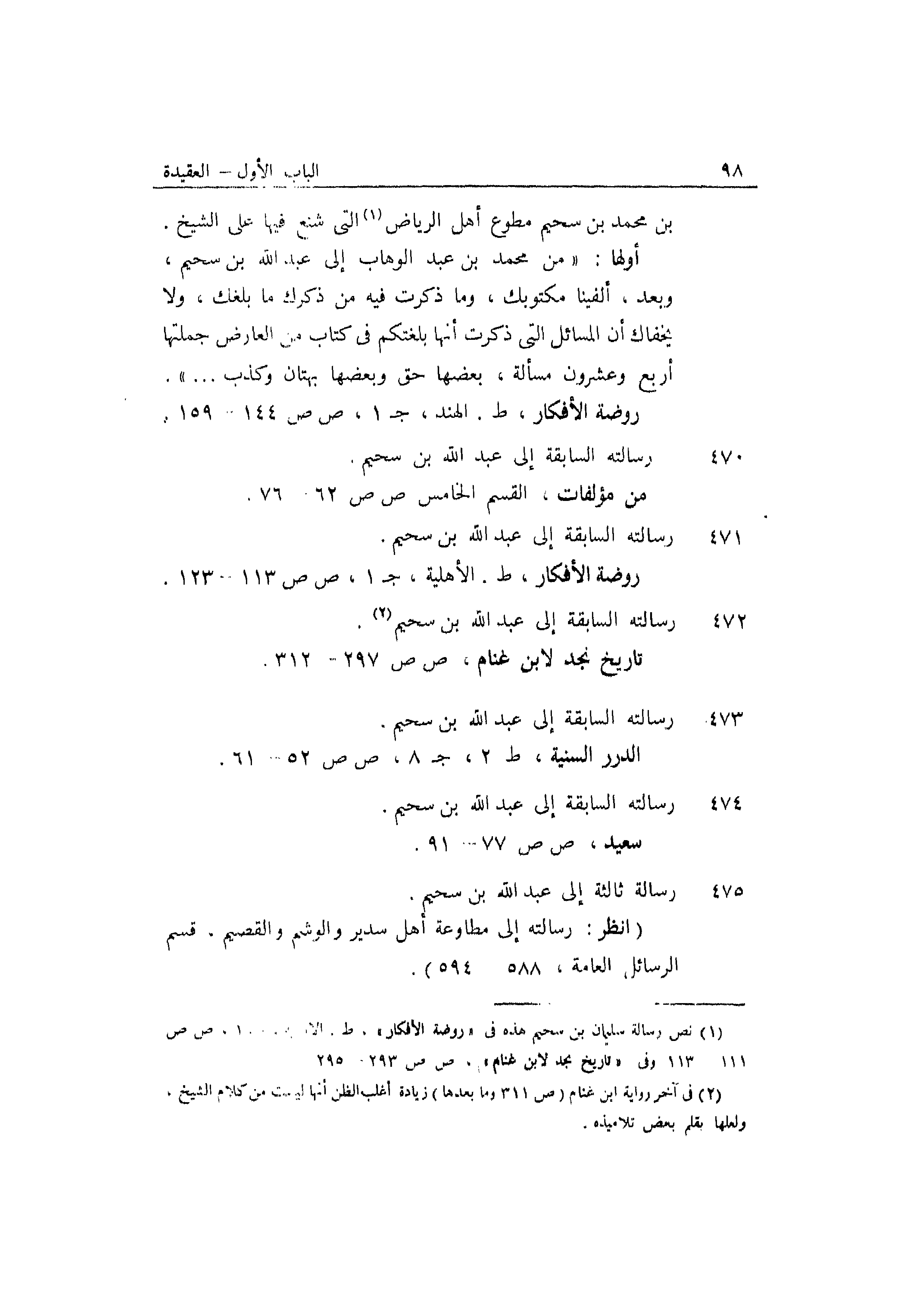 1 نص رسالة سليمان بن سحيم هذه في "روضة الأفكار"، ط الأهلية، جـ1، ص ص 111-113، وفي "تاريخ نجد لابن غنام"، ص ص 293-295.