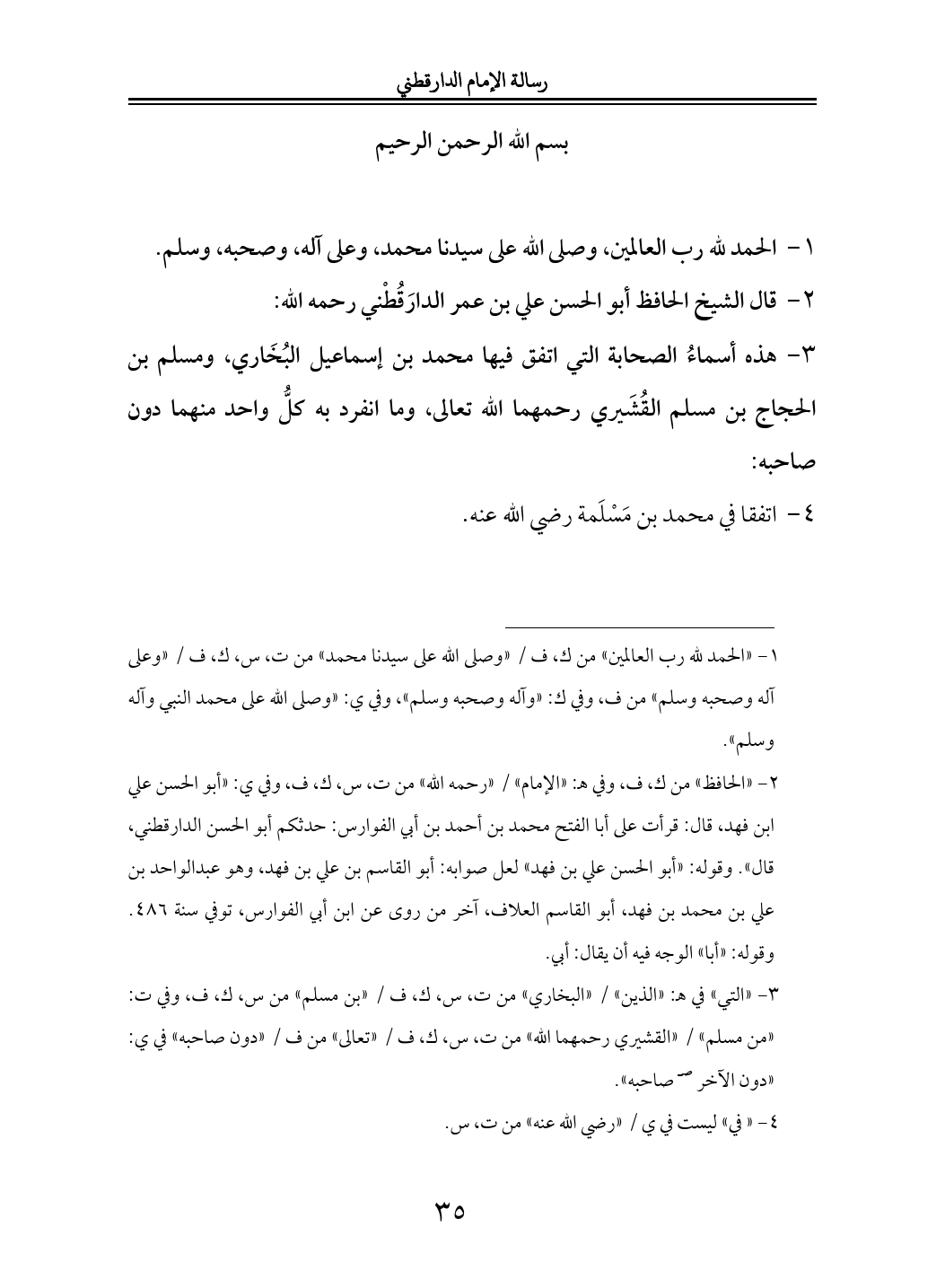 (¬١) ١ - «الحمد لله رب العالمين» من ك، ف / «وصلى الله على سيدنا محمد» من ت، س، ك، ف / «وعلى آله وصحبه وسلم» من ف، وفي ك: «وآله وصحبه وسلم»، وفي ي: «وصلى الله على محمد النبي وآله وسلم».