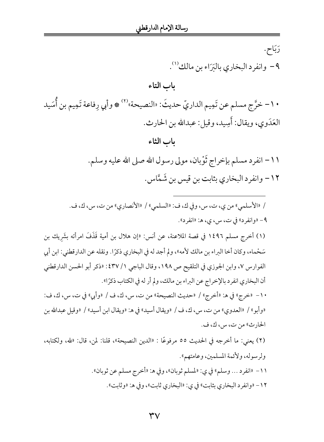 (¬٢) أخرج مسلم ١٤٩٦ في قصة الملاعنة، عن أنس: «إن هلال بن أمية قَذَفَ امرأته بشَرِيك بن سَحْماء، وكان أخا البراء بن مالك لأمه»، ولم أجد له في البخاري ذكرًا. ونقله عن الدارقطني: ابن أبي الفوارس ٧، وابن الجوزي في التلقيح ص ١٩٨، وقال الباجي ١/ ٤٣٧: «ذكر أبو الحسن الدارقطني أن البخاري انفرد بالإخراج عن البراء بن مالك، ولم أر له في الكتاب ذكرًا».