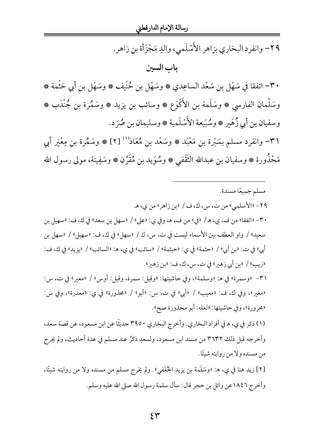 (¬٢) ٣٠ - «اتفقا» من ف، ي، هـ / «في» من ف، هـ، وفي ي: «على» / «سهل بن سعد» في ك، ف: «سهيل بن سعيد» / واو العطف بين الأسماء ليست في ت، س، ك / «سهل» في ك، ف: «سهيل» / «سهل بن أبي» في ت: «بن أبي» / «حثمة» في ي: «حيثمة» / «سائب» في ي، هـ: «السائب» / «يزيد» في ك، ف: «زيب» / «بن أبي زهير» في ت، س، ك، ف: «بن زهير».