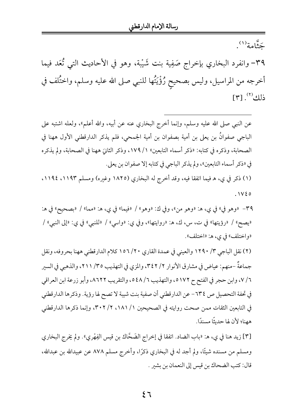 (¬٣) نقل الباجي ٣/ ١٢٩٠ والعيني في عمدة القاري ٢٠/ ١٥٦ كلام الدارقطني ههنا بحروفه، ونقل جماعةٌ -منهم: عياض في مشارق الأنوار ٢/ ٣٤٢، والمزي في التهذيب ٣٥/ ٢١١، والذهبي في السير ٦/ ٧، وابن حجر في الفتح ح ٥١٧٢، والتهذيب ٦/ ٥٤٨، والتقريب ٨٦٢٢، وأبو زرعة ابن العراقي في تحفة التحصيل ص ٦٣٤ - عن الدارقطني أن صفية بنت شيبة لا تصح لها رؤية. وذكرها الدارقطني في التابعين الثقات ممن صحت روايته في الصحيحين ١/ ١٨١، ٢/ ٣٠٢، وإنما ذكرها الدارقطني ههنا؛ لأن لها حديثًا مسندًا.