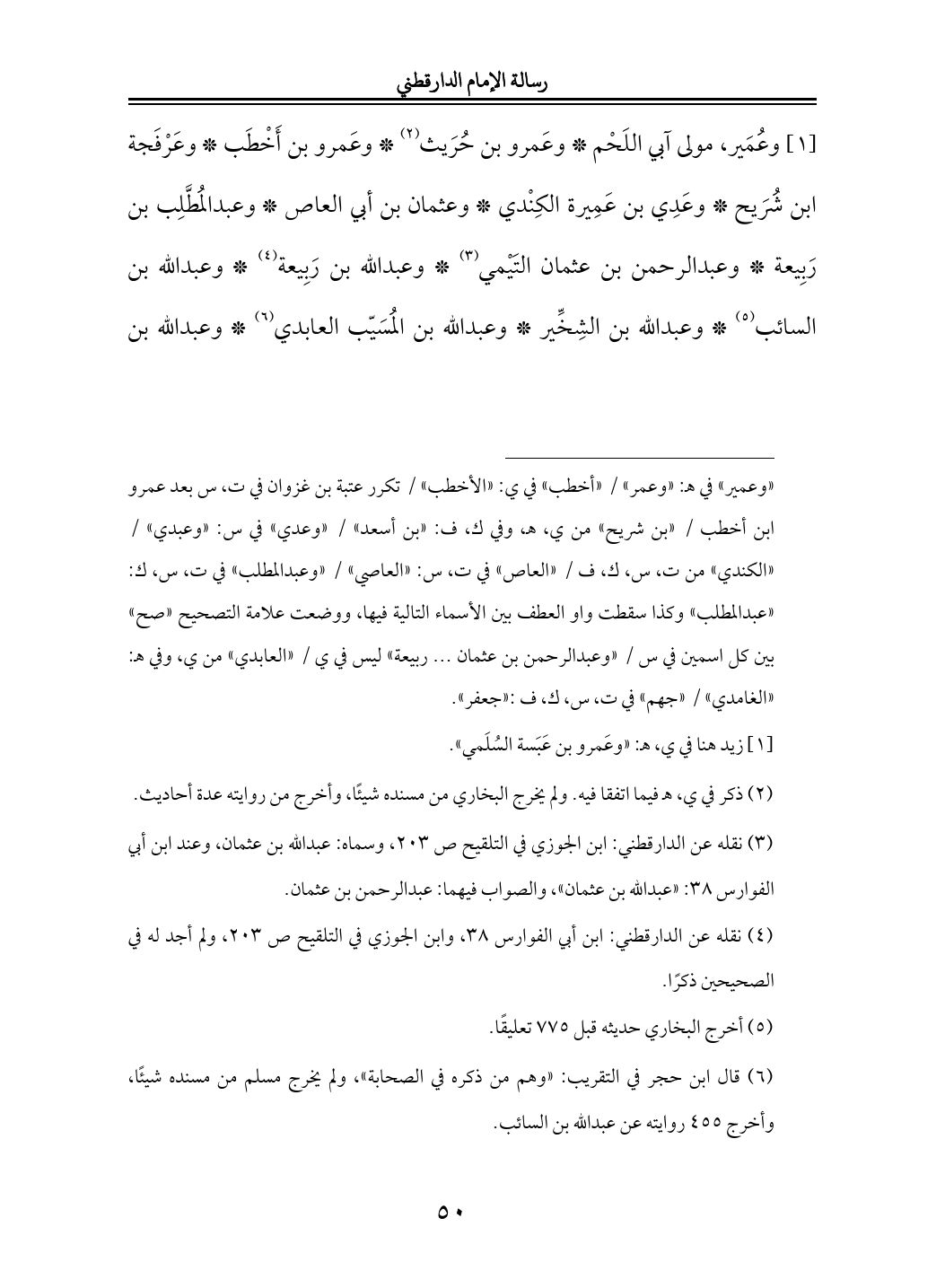 (¬٣) نقله عن الدارقطني: ابن الجوزي في التلقيح ص ٢٠٣، وسماه: عبدالله بن عثمان، وعند ابن أبي الفوارس ٣٨: «عبدالله بن عثمان»، والصواب فيهما: عبدالرحمن بن عثمان.