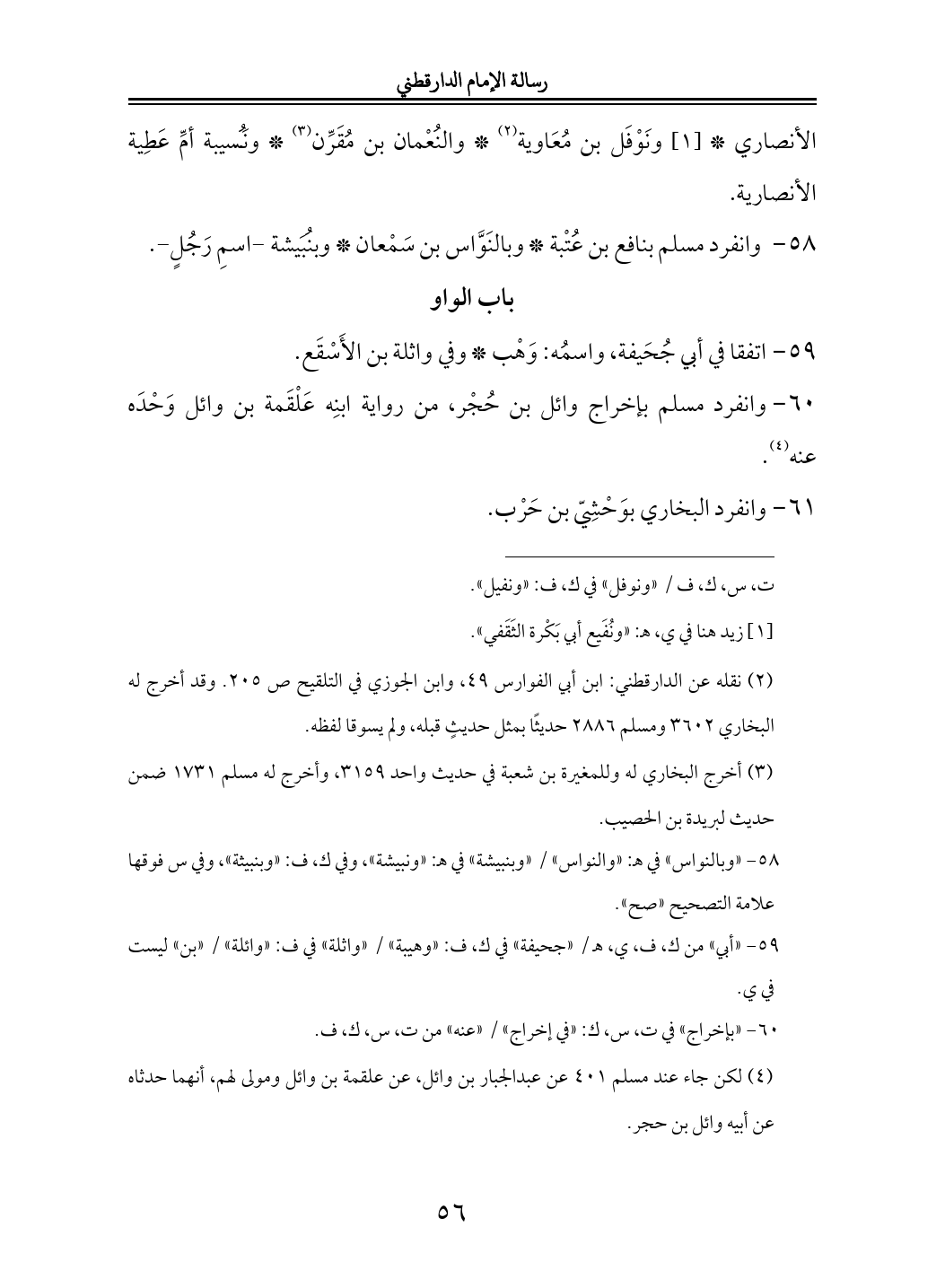 ٥٨ - (¬٤) وانفرد مسلم بنافع بن عُتْبة * وبالنَوَّاس بن سَمْعان * وبنُبَيشة -اسمِ رَجُلٍ-.