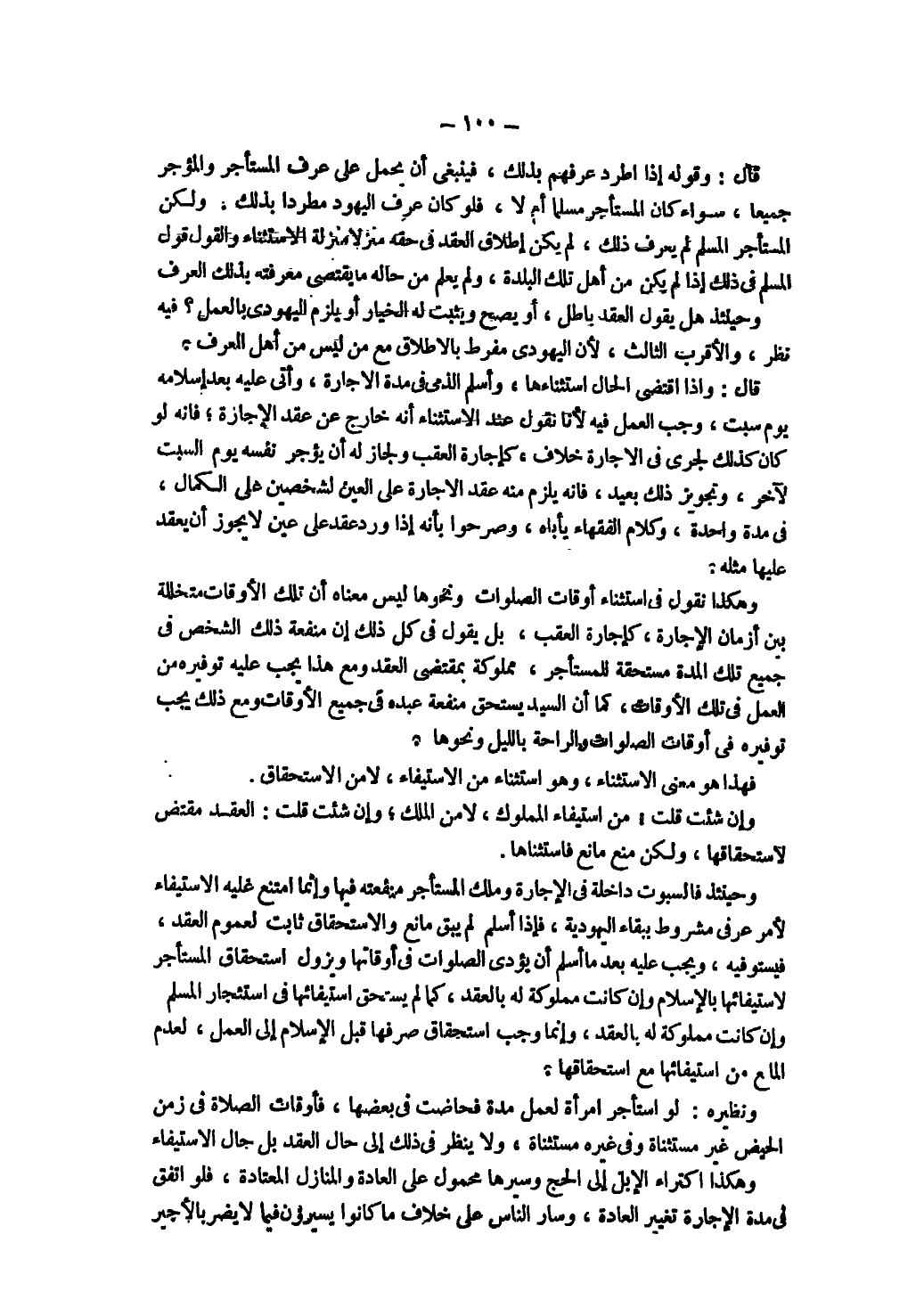 وَكَلَامُ الْفُقَهَاءِ يَأْبَاهُ، وَصَرَّحُوا بِأَنَّهُ إذَا وَرَدَ عَقْدٌ عَلَى عَيْنٍ لَا يَجُوزُ أَنْ يَعْقِدَ عَلَيْهَا مِثْلَهُ. وَهَكَذَا نَقُولُ فِي اسْتِثْنَاءِ أَوْقَاتِ الصَّلَوَاتِ وَنَحْوِهَا لَيْسَ مَعْنَاهُ أَنَّ تِلْكَ الْأَوْقَاتِ مُتَخَلَّلَةٌ بَيْن أَزْمَانِ الْإِجَارَةِ، كَإِجَارَةِ الْعَقِبِ، بَلْ يَقُولُ فِي كُلِّ ذَلِكَ إنَّ مَنْفَعَةَ ذَلِكَ الشَّخْصِ فِي جَمِيعِ تِلْكَ الْمُدَّةِ مُسْتَحَقَّةٌ لِلْمُسْتَأْجِرِ، مَمْلُوكَةٌ بِمُقْتَضَى الْعَقْدِ وَمَعَ هَذَا يَجِبُ عَلَيْهِ تَوْفِيرُهُ مِنْ الْعَمَلِ فِي تِلْكَ الْأَوْقَاتِ، كَمَا أَنَّ السَّيِّدَ يَسْتَحِقُّ مَنْفَعَةُ عَبْدِهِ فِي جَمِيعِ الْأَوْقَاتِ وَمَعَ ذَلِكَ يَجِبُ تَوْفِيرُهُ فِي أَوْقَاتِ الصَّلَوَاتِ وَالرَّاحَةِ بِاللَّيْلِ وَنَحْوِهَا.