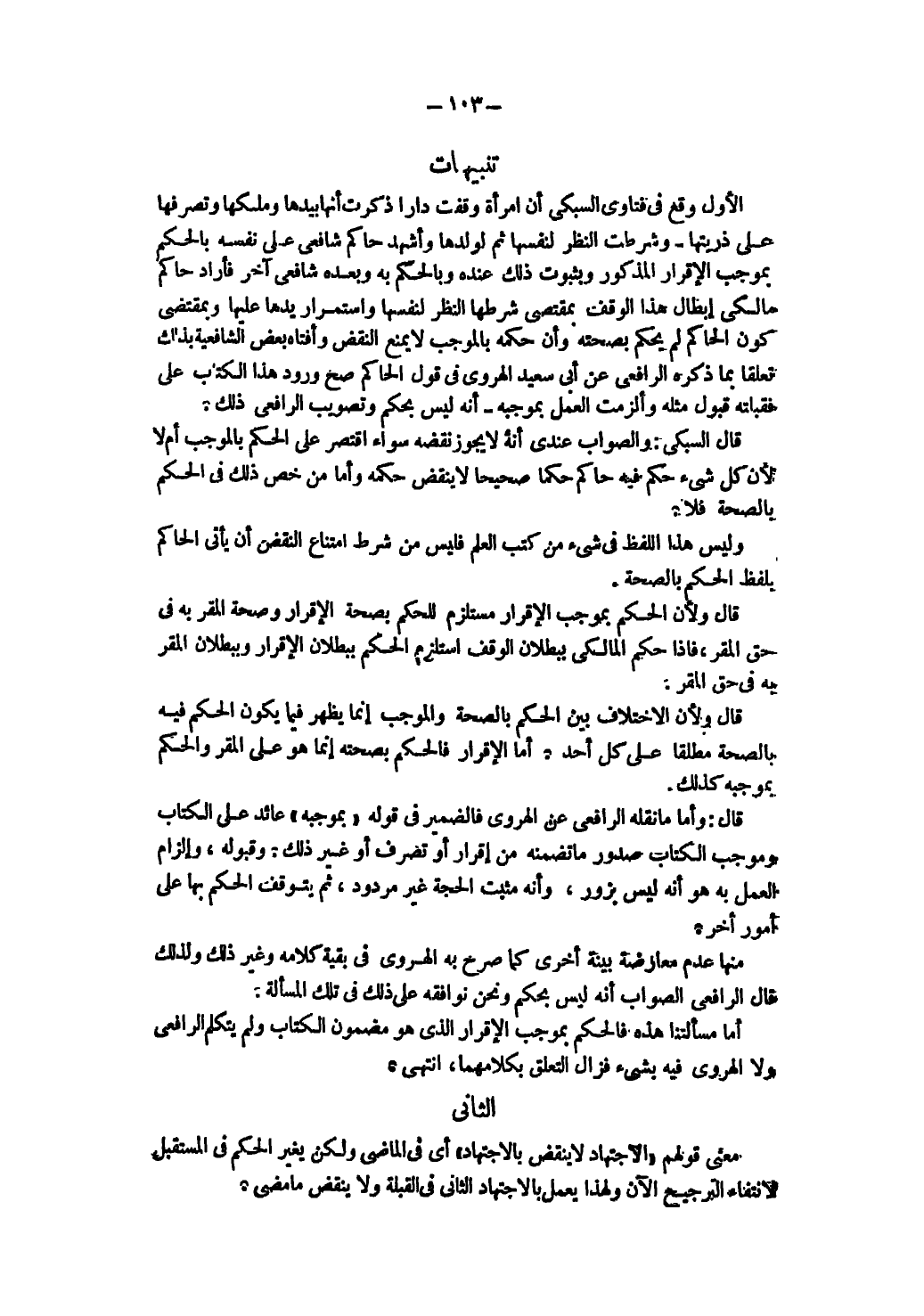 وَقَعَ فِي فَتَاوَى السُّبْكِيّ أَنَّ [امْرَأَةً وَقَفَتْ دَارًا ذَكَرَتْ أَنَّهَا بِيَدِهَا وَمِلْكِهَا وَتَصَرُّفِهَا عَلَى ذُرِّيَّتِهَا] وَشَرَطَتْ النَّظَرَ لِنَفْسِهَا ثُمَّ لِوَلَدِهَا وَأَشْهَدَ حَاكِمٌ شَافِعِيٌّ عَلَى نَفْسِهِ بِالْحُكْمِ بِمُوجِبِ الْإِقْرَارِ الْمَذْكُورِ وَبِثُبُوتِ ذَلِكَ عِنْدَهُ وَبِالْحُكْمِ بِهِ وَبَعْدَهُ شَافِعِيٌّ آخَرُ فَأَرَادَ حَاكِمٌ مَالِكِيٌّ إبْطَالَ هَذَا الْوَقْفِ بِمُقْتَضَى شَرْطِهَا النَّظَرَ لِنَفْسِهَا وَاسْتِمْرَارِ يَدهَا عَلَيْهَا وَبِمُقْتَضَى كَوْن الْحَاكِم لَمْ يَحْكُمْ بِصِحَّتِهِ وَأَنَّ حُكْمَهُ بِالْمُوجِبِ لَا يَمْنَعُ النَّقْضَ وَأَفْتَاهُ بَعْضُ الشَّافِعِيَّةِ بِذَلِكَ تَعَلُّقًا بِمَا ذَكَرَهُ الرَّافِعِيُّ عَنْ أَبِي سَعِيدِ الْهَرَوِيِّ فِي قَوْلِ الْحَاكِمِ صَحَّ وُرُودُ هَذَا الْكِتَابِ عَلَيَّ فَقَبِلْته قَبُولَ مِثْلِهِ وَأُلْزِمْت الْعَمَلَ بِمُوجِبِهِ أَنَّهُ لَيْسَ بِحُكْمِ وَتَصْوِيبِ الرَّافِعِيِّ ذَلِكَ.