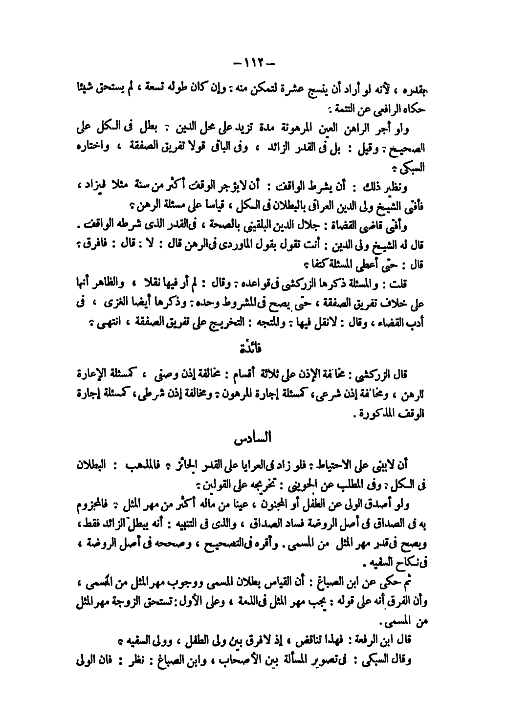 وَأَفْتَى قَاضِي الْقُضَاةِ: جَلَالُ الدِّينِ الْبُلْقِينِيُّ بِالصِّحَّةِ، فِي الْقَدْرِ الَّذِي شَرَطَهُ الْوَاقِف. قَالَ لَهُ الشَّيْخُ وَلِيُّ الدِّينِ: أَنْتَ تَقُولُ بِقَوْلِ الْمَاوَرْدِيِّ فِي الرَّهْنِ قَالَ: لَا. قَالَ: فَافْرُقْ. قَالَ: حَتَّى أُعْطِي الْمَسْأَلَةَ كَتِفًا.