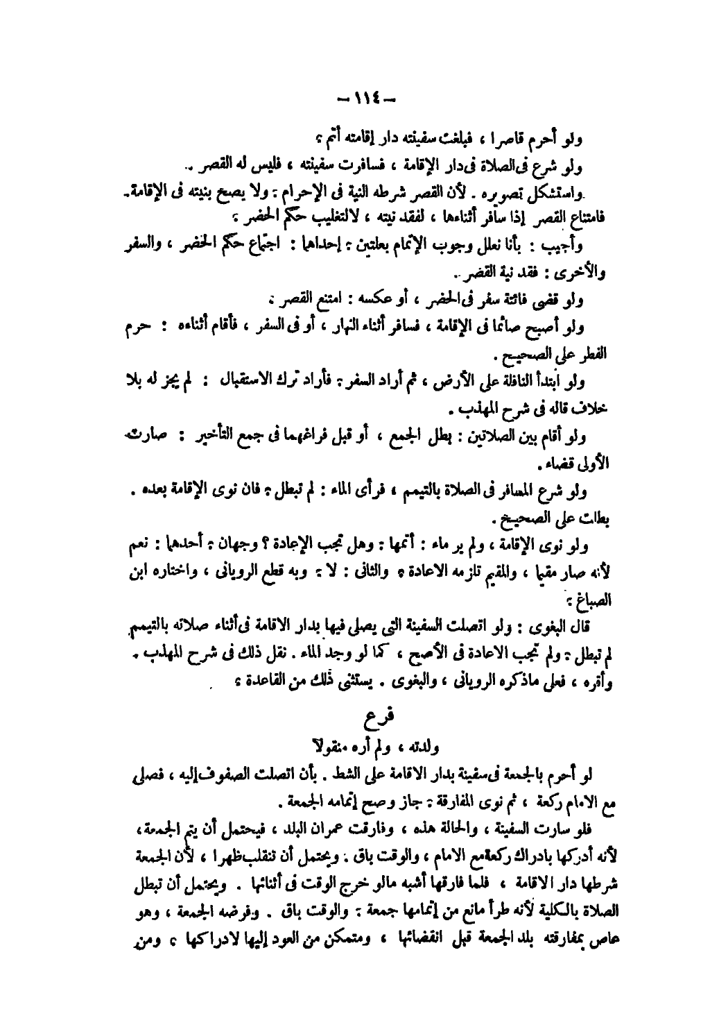 وَلَدْتُهُ، وَلَمْ أَرَهُ مَنْقُولًا لَوْ أَحْرَمَ بِالْجُمُعَةِ فِي سَفِينَةٍ بِدَارِ الْإِقَامَةِ عَلَى الشَّطِّ ; بِأَنْ اتَّصَلَتْ الصُّفُوفُ إلَيْهِ، فَصَلَّى مَعَ الْإِمَام رَكْعَة، ثُمَّ نَوَى الْمُفَارَقَة جَازَ وَصَحَّ إتْمَامُهُ الْجُمُعَة.