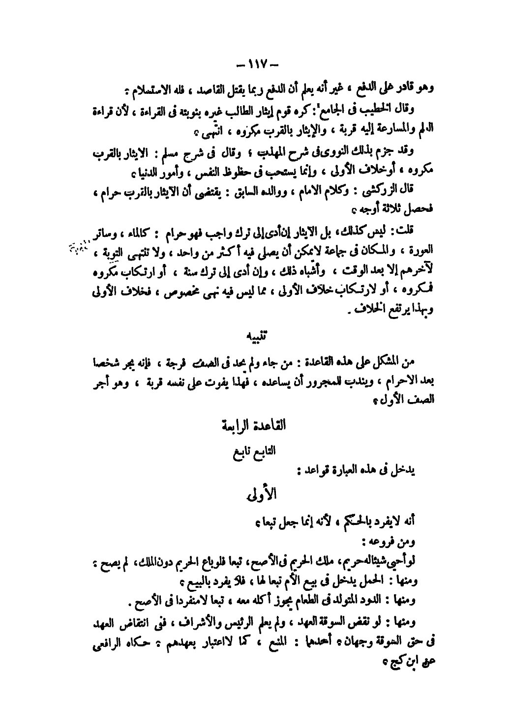 قَالَ الزَّرْكَشِيُّ: وَكَلَامُ الْإِمَامِ وَوَالِدِهِ السَّابِق: يَقْتَضِي أَنَّ الْإِيثَارَ بِالْقُرْبِ حَرَامٌ، فَحَصَلَ ثَلَاثَةُ أَوْجُهٍ.