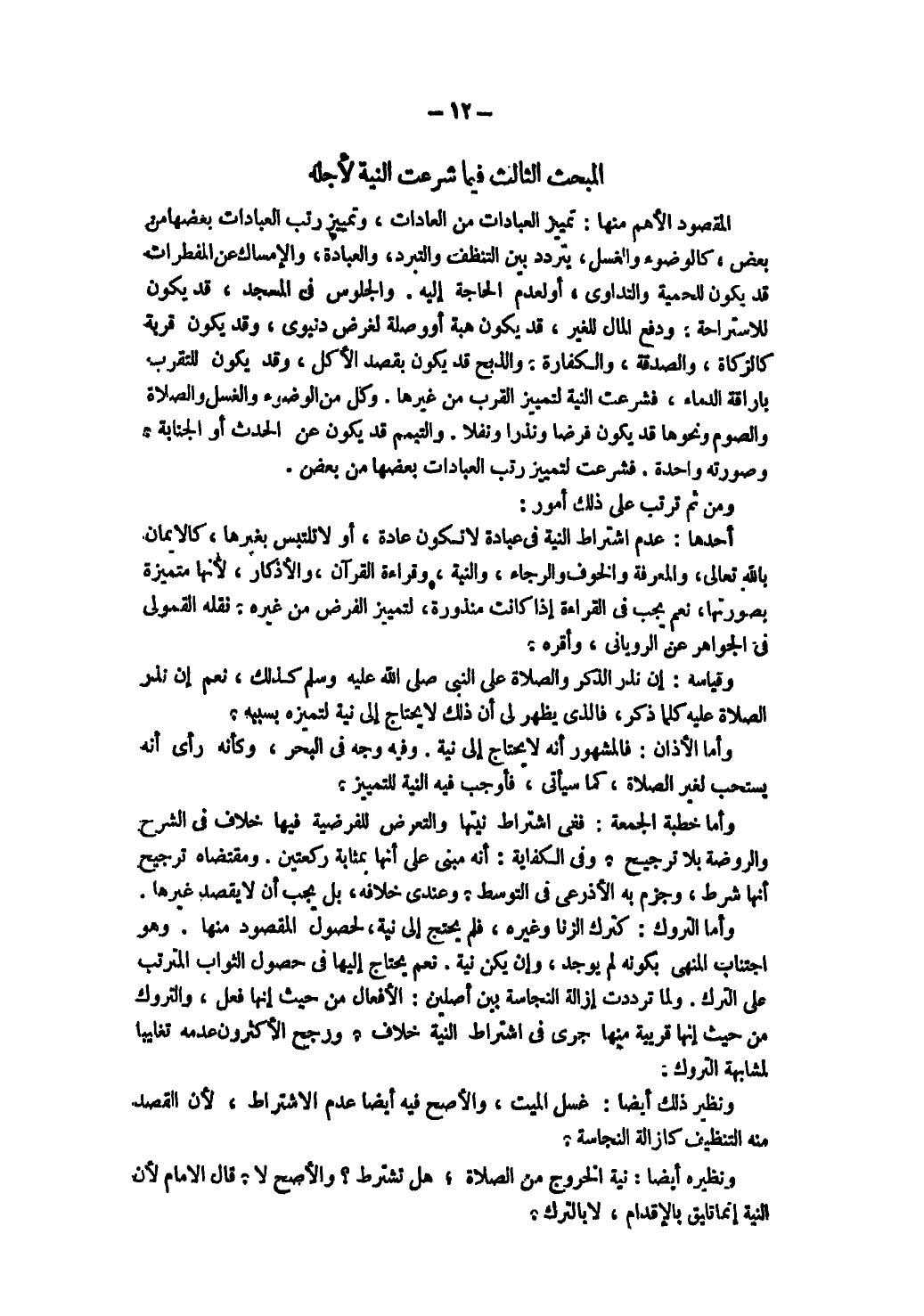 الْمَقْصُودُ الْأَهَمّ مِنْهَا: تَمْيِيز الْعِبَادَات مِنْ الْعَادَات، وَتَمْيِيز رُتَب الْعِبَادَات بَعْضهَا مِنْ بَعْض، كَالْوُضُوءِ وَالْغُسْل، يَتَرَدَّد بَيْن التَّنَظُّف وَالتَّبَرُّد، وَالْعِبَادَة، وَالْإِمْسَاك عَنْ الْمُفْطِرَات قَدْ يَكُون لِلْحُمِّيَّةِ وَالتَّدَاوِي، أَوْ لِعَدَمِ الْحَاجَة إلَيْهِ، وَالْجُلُوس فِي الْمَسْجِد، قَدْ يَكُون لِلِاسْتِرَاحَةِ، وَدَفْعُ الْمَال لِلْغَيْرِ، قَدْ يَكُون هِبَة أَوْ وَصْلَة لِغَرَضٍ دُنْيَوِيّ، وَقَدْ يَكُون قُرْبَة كَالزَّكَاةِ، وَالصَّدَقَة، وَالْكَفَّارَة، وَالذَّبْح قَدْ يَكُون بِقَصْدِ الْأَكْل، وَقَدْ يَكُون لِلتَّقَرُّبِ بِإِرَاقَةِ الدِّمَاء، فَشُرِعَتْ النِّيَّة لِتَمْيِيزِ الْقُرَبِ مِنْ غَيْرهَا، وَكُلٌّ مِنْ الْوُضُوء وَالْغُسْل وَالصَّلَاة وَالصَّوْم وَنَحْوهَا قَدْ يَكُون فَرْضَا وَنَذْرًا وَنَفْلًا، وَالتَّيَمُّم قَدْ يَكُون عَنْ الْحَدَث أَوْ الْجَنَابَة وَصُورَته وَاحِدَة، فَشُرِعَتْ لِتَمْيِيزِ رُتَب الْعِبَادَات بَعْضهَا مِنْ بَعْض.