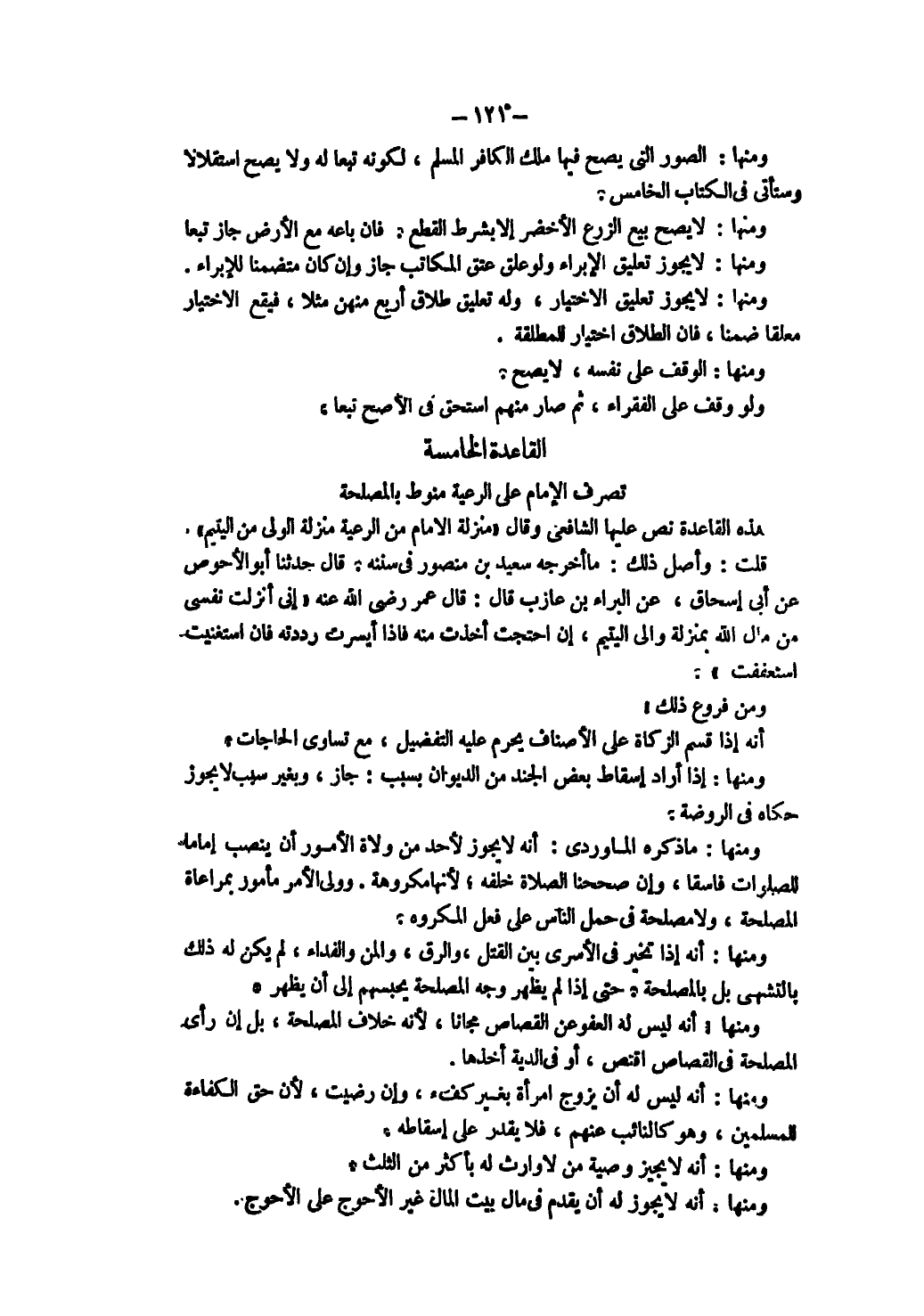 [الْقَاعِدَةُ الْخَامِسَةُ: تَصَرُّفُ الْإِمَامِ عَلَى الرَّعِيَّةِ مَنُوطٌ بِالْمَصْلَحَةِ]
