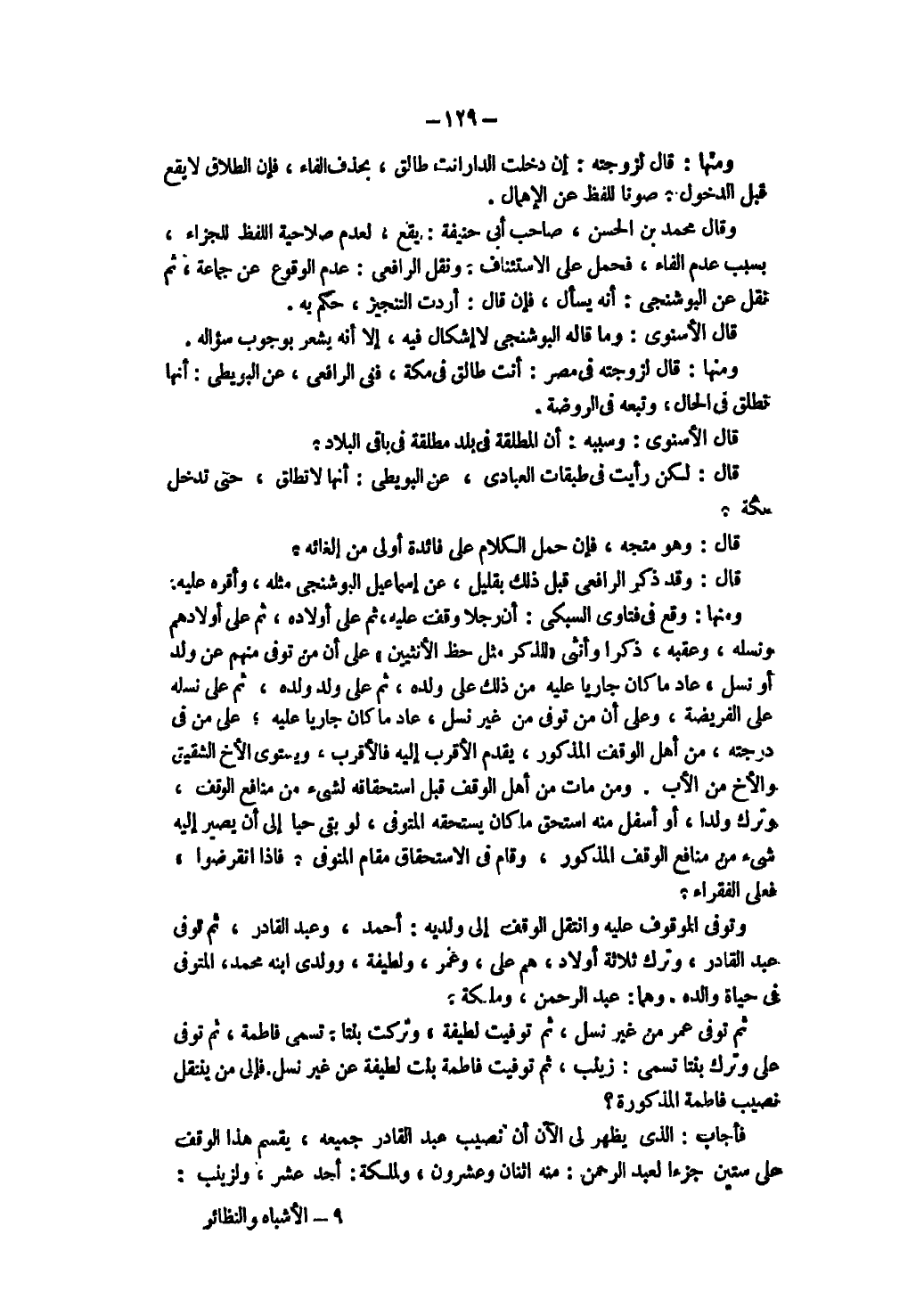 قَالَ: وَقَدْ ذَكَرَ الرَّافِعِيُّ قَبْل ذَلِكَ بِقَلِيلٍ، عَنْ إسْمَاعِيلَ الْبُوشَنْجِيِّ مِثْلَهُ، وَأَقَرَّهُ عَلَيْهِ. وَمِنْهَا: وَقَعَ فِي فَتَاوَى السُّبْكِيّ: أَنَّ رَجُلًا وُقِفَ عَلَيْهِ، ثُمَّ عَلَى أَوْلَادِهِ، ثُمَّ عَلَى أَوْلَادِهِمْ وَنَسْلِهِ، وَعَقِبِهِ، ذَكَرًا وَأُنْثَى {لِلذَّكَرِ مِثْلُ حَظِّ الْأُنْثَيَيْنِ} [النساء: ١١] عَلَى أَنَّ مَنْ تُوُفِّيَ مِنْهُمْ عَنْ وَلَدٍ أَوْ نَسْلٍ، عَادَ مَا كَانَ جَارِيًا عَلَيْهِ مِنْ ذَلِكَ عَلَى وَلَدِهِ، ثُمَّ عَلَى وَلَدِ وَلَدِهِ، ثُمَّ عَلَى نَسْلِهِ عَلَى الْفَرِيضَةِ، وَعَلَى أَنَّ مَنْ تُوُفِّيَ مِنْ غَيْرِ نَسْلٍ، عَادَ مَا كَانَ جَارِيًا عَلَيْهِ ; عَلَى مَنْ فِي دَرَجَتِهِ مِنْ أَهْلِ الْوَقْفِ الْمَذْكُور، يُقَدِّمُ الْأَقْرَبَ إلَيْهِ فَالْأَقْرَبِ، وَيَسْتَوِي الْأَخُ الشَّقِيقُ وَالْأَخُ مِنْ الْأَبِ.