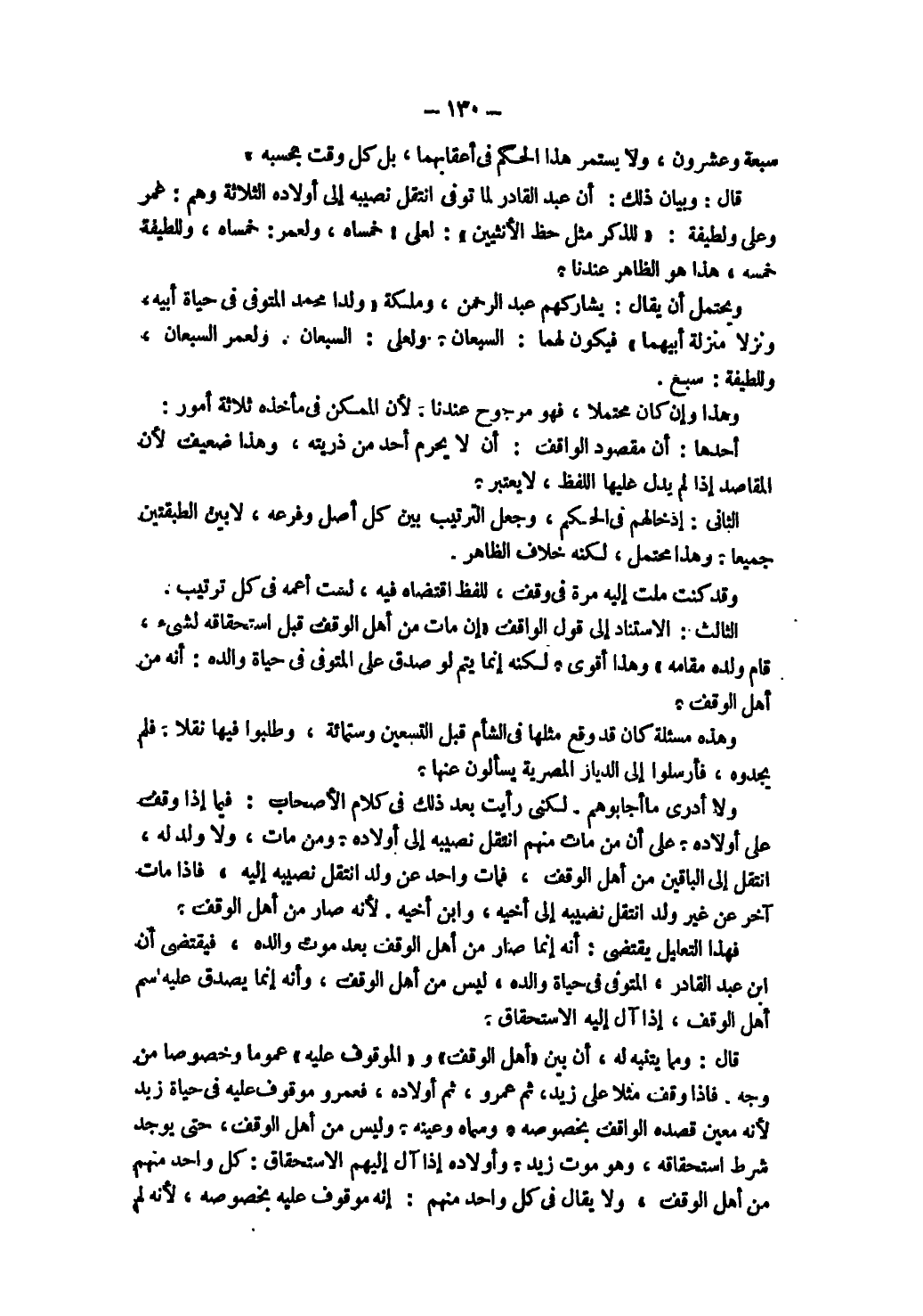 فَهَذَا التَّعْلِيلُ يَقْتَضِي: أَنَّهُ إنَّمَا صَارَ مِنْ أَهْلِ الْوَقْفِ بَعْد مَوْتِ وَالِدِهِ فَيَقْتَضِي أَنَّ ابْنَ عَبْدَ الْقَادِرِ، الْمُتَوَفَّى فِي حَيَاةِ وَالِدِهِ، لَيْسَ مِنْ أَهْلِ الْوَقْفِ، وَأَنَّهُ إنَّمَا يَصْدُقُ عَلَيْهِ اسْمُ أَهْلِ الْوَقْفِ، إذَا آلَ إلَيْهِ الِاسْتِحْقَاقُ.