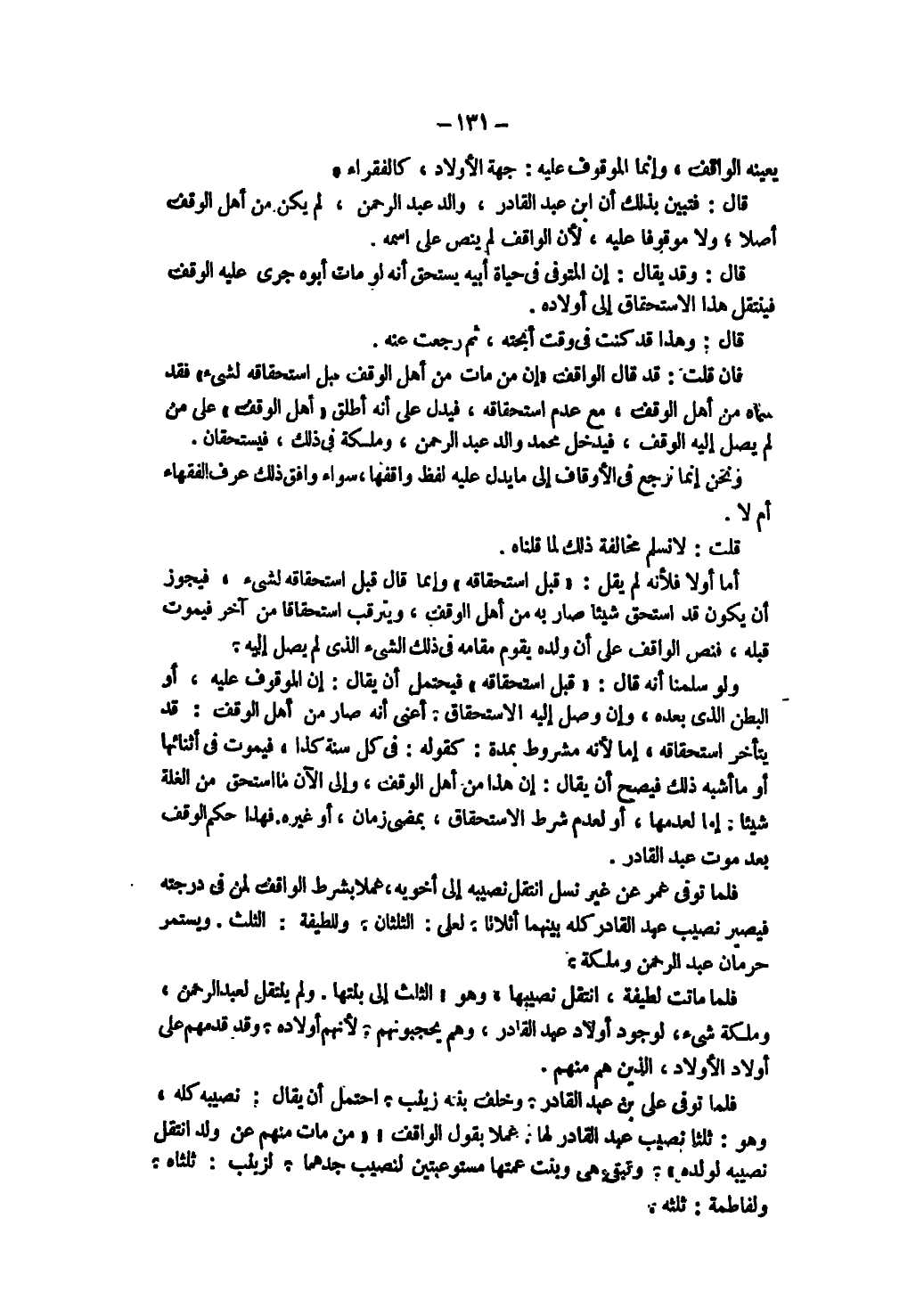 قَالَ: فَتَبَيَّنَ بِذَلِكَ أَنَّ ابْنَ عَبْدِ الْقَادِرِ، وَالِدَ عَبْدِ الرَّحْمَنِ، لَمْ يَكُنْ مِنْ أَهْلِ الْوَقْف أَصْلًا ; وَلَا مَوْقُوفًا عَلَيْهِ، لِأَنَّ الْوَاقِف لَمْ يَنُصَّ عَلَى اسْمِهِ.