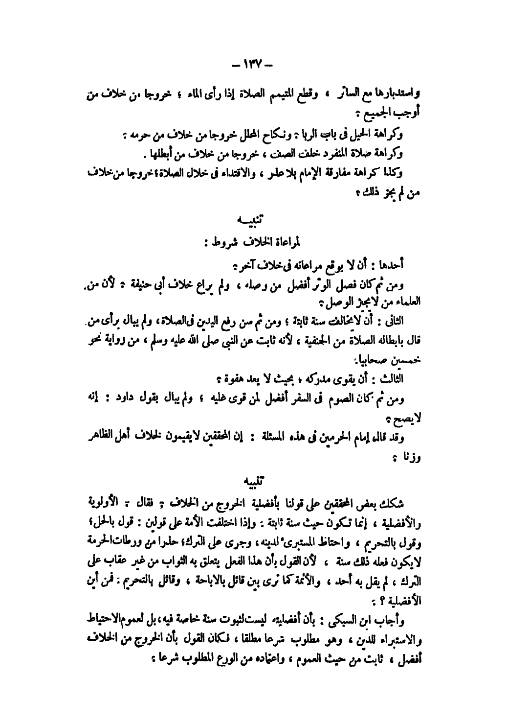 لِمُرَاعَاةِ الْخِلَافِ شُرُوطٌ: أَحَدُهَا: أَنْ لَا يُوقِعَ مُرَاعَاتُهُ فِي خِلَافٍ آخَرَ، وَمِنْ ثَمَّ كَانَ فَصْلُ الْوِتْرِ أَفْضَلَ مِنْ وَصْلِهِ، وَلَمْ يُرَاعِ خِلَافَ أَبِي حَنِيفَةَ لِأَنَّ مِنْ الْعُلَمَاءِ مَنْ لَا يُجِيزُ الْوَصْلَ.