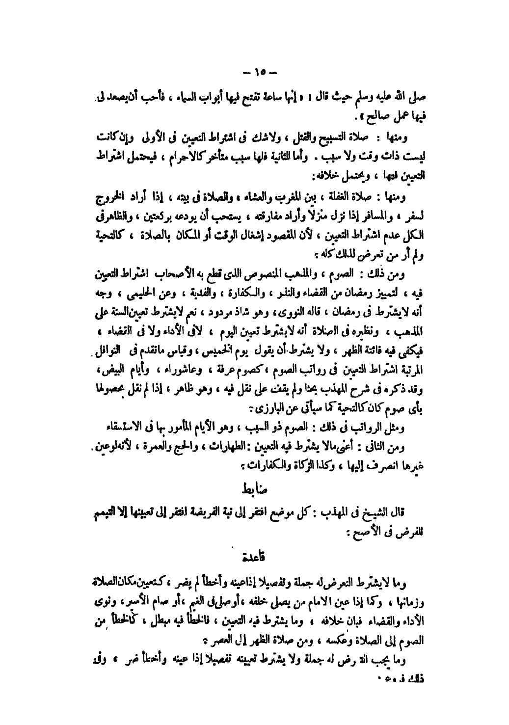 وَمِنْ ذَلِكَ: الصَّوْم، وَالْمَذْهَب الْمَنْصُوص الَّذِي قَطَعَ بِهِ الْأَصْحَابُ اشْتِرَاط التَّعْيِين فِيهِ، لِتَمْيِيزِ رَمَضَان مِنْ الْقَضَاء وَالنَّذْر، وَالْكَفَّارَة، وَالْفِدْيَة، وَعَنْ الْحَلِيمِيِّ، وَجْه أَنَّهُ لَا يُشْتَرَط فِي رَمَضَان، قَالَهُ النَّوَوِيُّ، وَهُوَ شَاذٌّ مَرْدُود، نَعَمْ لَا يُشْتَرَط تَعْيِين السَّنَة عَلَى الْمَذْهَب، وَنَظِيره فِي الصَّلَاة أَنَّهُ لَا يُشْتَرَط تَعْيِين الْيَوْم، لَا فِي الْأَدَاء وَلَا فِي الْقَضَاء، فَيَكْفِي فِيهِ فَائِتَة الظُّهْر، وَلَا يُشْتَرَط أَنْ يَقُولَ يَوْم الْخَمِيس، وَقِيَاسُ مَا تَقَدَّمَ فِي النَّوَافِل الْمُرَتَّبَة اشْتِرَاطُ التَّعْيِين فِي رَوَاتِب الصَّوْم، كَصَوْمِ عَرَفَةَ، وَعَاشُورَاءَ، وَأَيَّامِ الْبِيضِ، وَقَدْ ذَكَرَهُ فِي شَرْحِ الْمُهَذَّبِ بَحْثًا وَلَمْ يَقِف عَلَى نَقْلٍ فِيهِ، وَهُوَ ظَاهِر، إذَا لَمْ نَقُلْ بِحُصُولِهَا بِأَيِّ صَوْمٍ كَانَ كَالتَّحِيَّةِ كَمَا سَيَأْتِي عَنْ الْبَارِزِيِّ.