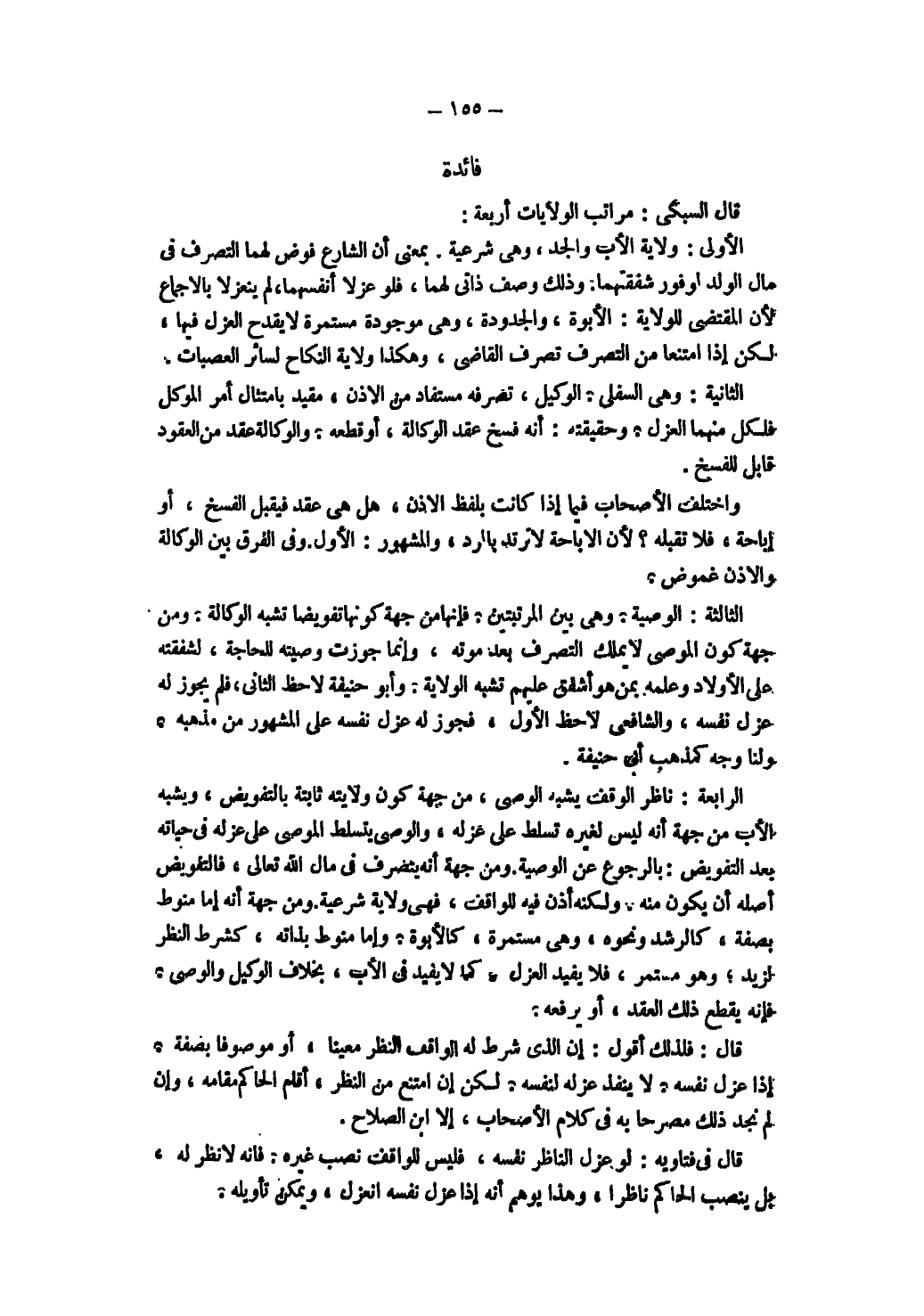 فَائِدَةٌ: قَالَ السُّبْكِيُّ: مَرَاتِبُ الْوِلَايَةِ أَرْبَعَةٌ: الْأُولَى: وِلَايَةُ الْأَبِ وَالْجَدِّ، وَهِيَ شَرْعِيَّةٌ. بِمَعْنَى أَنَّ الشَّارِعَ فَوَّضَ لَهُمَا التَّصَرُّفَ فِي مَالِ الْوَلَدِ لِوُفُورِ شَفَقَتِهِمَا. وَذَلِكَ وَصْفٌ ذَاتِيٌّ لَهُمَا، فَلَوْ عَزَلَا أَنْفُسَهُمَا، لَمْ يَنْعَزِلَا بِالْإِجْمَاعِ ; لِأَنَّ الْمُقْتَضِي لِلْوِلَايَةِ: الْأُبُوَّةُ، وَالْجُدُودَةُ، وَهِيَ مَوْجُودَةٌ مُسْتَمِرَّةٌ لَا يَقْدَحُ الْعَزْلُ فِيهَا، لَكِنْ إذَا امْتَنَعَا مِنْ التَّصَرُّفِ تَصَرَّفَ الْقَاضِي، وَهَكَذَا وِلَايَةُ النِّكَاح لِسَائِرِ الْعَصَبَاتِ.
