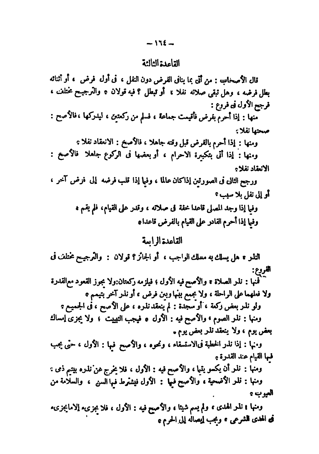 الْقَاعِدَةُ الثَّالِثَةُ قَالَ الْأَصْحَابُ: مَنْ أَتَى بِمَا يُنَافِي الْفَرْضَ دُونَ النَّفْلِ، فِي أَوَّلِ فَرْضٍ، أَوْ أَثْنَائِهِ بَطَلَ فَرْضُهُ، وَهَلْ تَبْقَى صَلَاتُهُ نَفْلًا، أَوْ تَبْطُلُ؟ فِيهِ قَوْلَانِ. وَالتَّرْجِيحُ مُخْتَلِفٌ، فَرُجِّحَ الْأَوَّلُ فِي فُرُوعٍ: