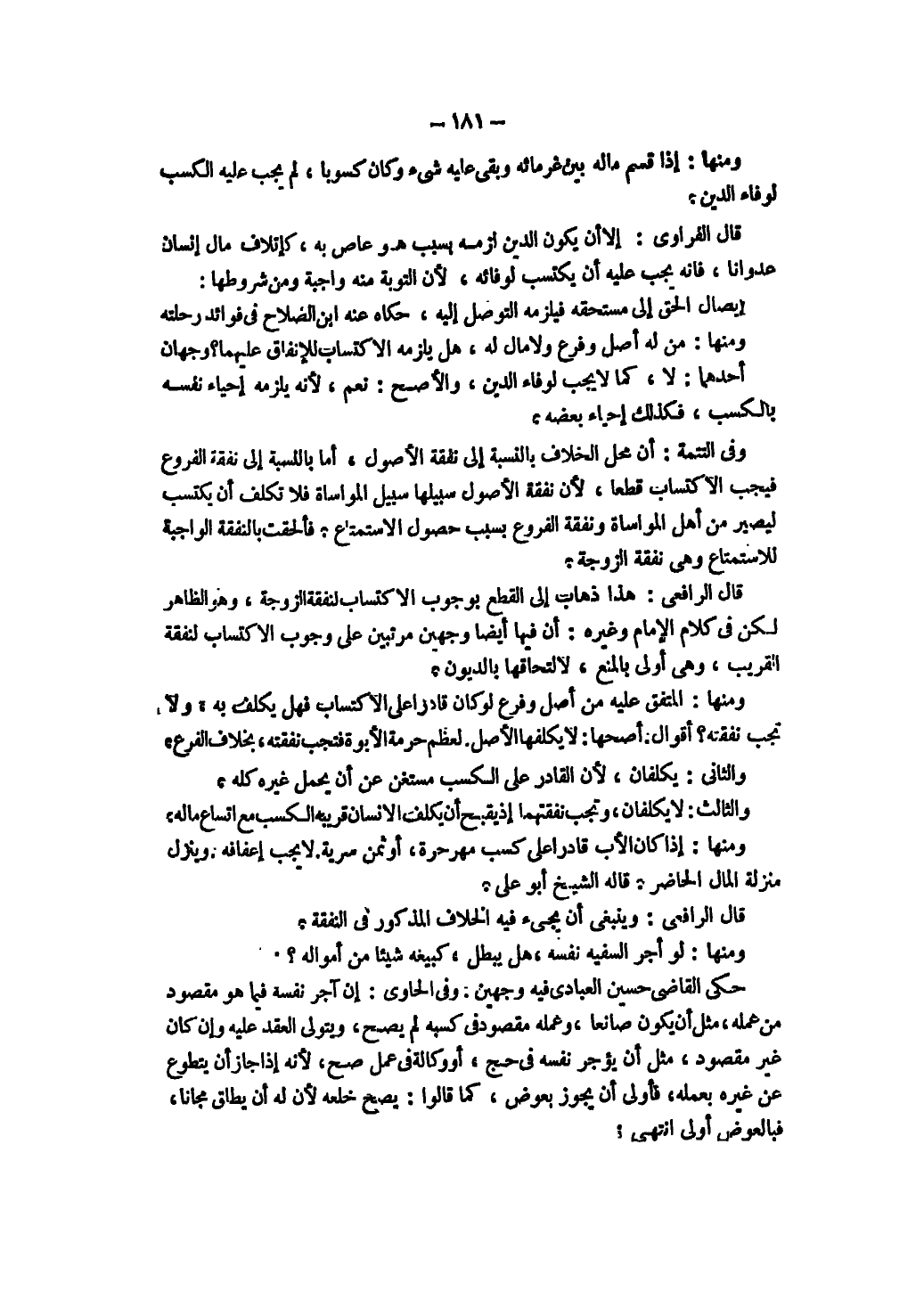 قَالَ الْفَرَاوِيُّ: إلَّا أَنْ يَكُونَ الدَّيْنُ لَزِمَهُ بِسَبَبٍ هُوَ عَاصٍ بِهِ، كَإِتْلَافِ مَالِ إنْسَانٍ عُدْوَانًا، فَإِنَّهُ يَجِبُ عَلَيْهِ أَنْ يَكْتَسِبَ لِوَفَائِهِ ; لِأَنَّ التَّوْبَةَ مِنْهُ وَاجِبَةٌ وَمِنْ شُرُوطِهَا: إيصَالُ الْحَقِّ إلَى مُسْتَحِقِّهِ فَيَلْزَمُهُ التَّوَصُّلُ إلَيْهِ، حَكَاهُ عَنْهُ ابْنُ الصَّلَاحِ فِي فَوَائِدِ رِحْلَتِهِ وَمِنْهَا: مَنْ لَهُ أَصْلٌ وَفَرْعٌ وَلَا مَالَ لَهُ، هَلْ يَلْزَمُهُ الِاكْتِسَابُ لِلْإِنْفَاقِ عَلَيْهِمَا؟ وَجْهَانِ، أَحَدُهُمَا: لَا، كَمَا لَا يَجِب لِوَفَاءِ الدَّيْنِ، وَالْأَصَحُّ: نَعَمْ ; لِأَنَّهُ يَلْزَمُهُ إحْيَاءُ نَفْسِهِ بِالْكَسْبِ، فَكَذَلِكَ إحْيَاءُ بَعْضِهِ.