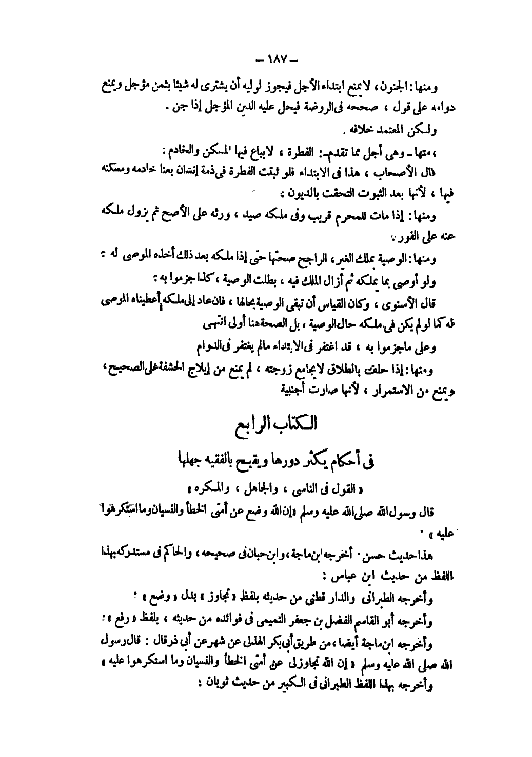 الْكِتَابُ الرَّابِعُ فِي أَحْكَامٍ يَكْثُرُ دَوْرُهَا وَيَقْبَحُ بِالْفَقِيهِ جَهْلُهَا " الْقَوْلُ فِي النَّاسِي، وَالْجَاهِلِ، وَالْمُكْرَهِ " قَالَ رَسُولُ اللَّهِ: صَلَّى اللَّهُ عَلَيْهِ وَسَلَّمَ «إنَّ اللَّهَ وَضَعَ عَنْ أُمَّتِي الْخَطَأَ وَالنِّسْيَانَ وَمَا اُسْتُكْرِهُوا عَلَيْهِ» . هَذَا حَدِيثٌ حَسَنٌ. أَخْرَجَهُ ابْنُ مَاجَهْ، وَابْنُ حِبَّانَ فِي صَحِيحِهِ، وَالْحَاكِمُ فِي مُسْتَدْرَكِهِ بِهَذَا اللَّفْظِ مِنْ حَدِيثِ ابْنِ عَبَّاسٍ: وَأَخْرَجَهُ الطَّبَرَانِيُّ وَالدَّارَقُطْنِيّ مِنْ حَدِيثِهِ بِلَفْظِ «تَجَاوَزَ» بَدَلَ «وَضَعَ» . وَأَخْرَجَهُ أَبُو الْقَاسِمِ الْفَضْلُ بْنُ جَعْفَرٍ التَّمِيمِيُّ فِي فَوَائِدِهِ مِنْ حَدِيثِهِ، بِلَفْظِ «رَفَعَ»