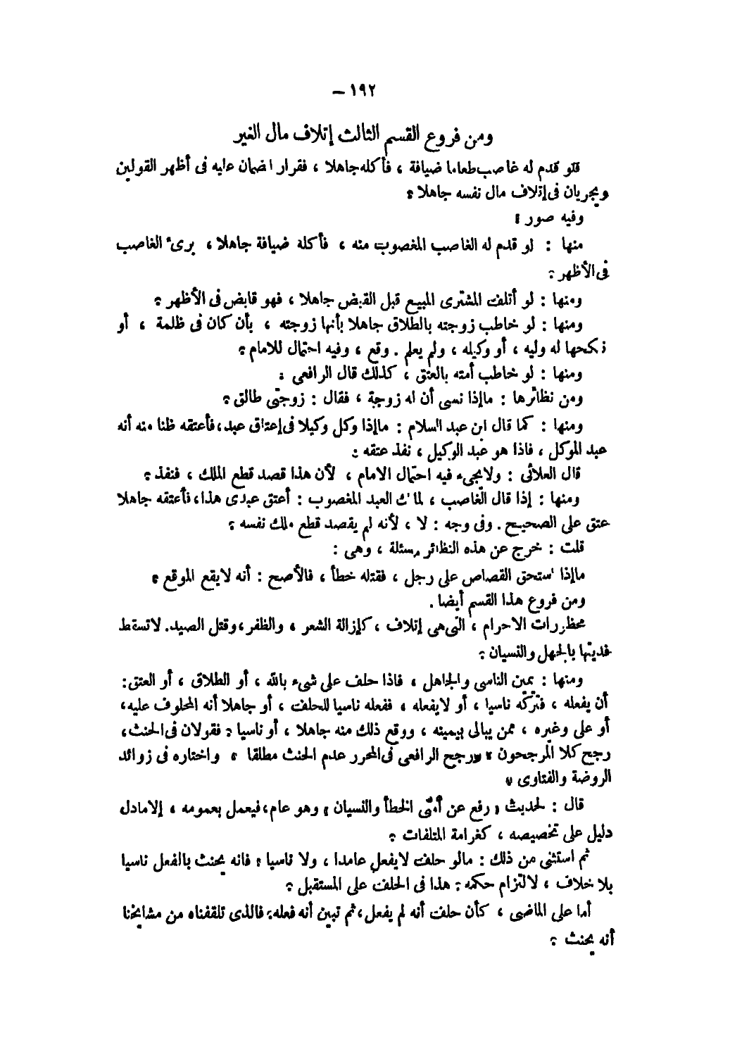 وَمِنْهَا: يَمِينُ النَّاسِي وَالْجَاهِلِ، فَإِذَا حَلَفَ عَلَى شَيْءٍ بِاَللَّهِ، أَوْ الطَّلَاقِ، أَوْ الْعِتْقِ: أَنْ يَفْعَلَهُ، فَتَرَكَهُ نَاسِيًا، أَوْ لَا يَفْعَلُهُ، فَفَعَلَهُ نَاسِيًا لِلْحَلْفِ، أَوْ جَاهِلًا أَنَّهُ الْمَحْلُوفُ عَلَيْهِ، أَوْ عَلَى غَيْرِهِ، مِمَّنْ يُبَالِي بِيَمِينِهِ، وَوَقَعَ ذَلِكَ مِنْهُ جَاهِلًا، أَوْ نَاسِيًا، فَقَوْلَانِ فِي الْحِنْثِ، رَجَّحَ كُلًّا الْمُرَجِّحُونَ. وَرَجَّحَ الرَّافِعِيُّ فِي الْمُحَرَّرِ عَدَمَ الْحِنْثِ مُطْلَقًا، وَاخْتَارَهُ فِي زَوَائِدِ الرَّوْضَةِ وَالْفَتَاوَى.