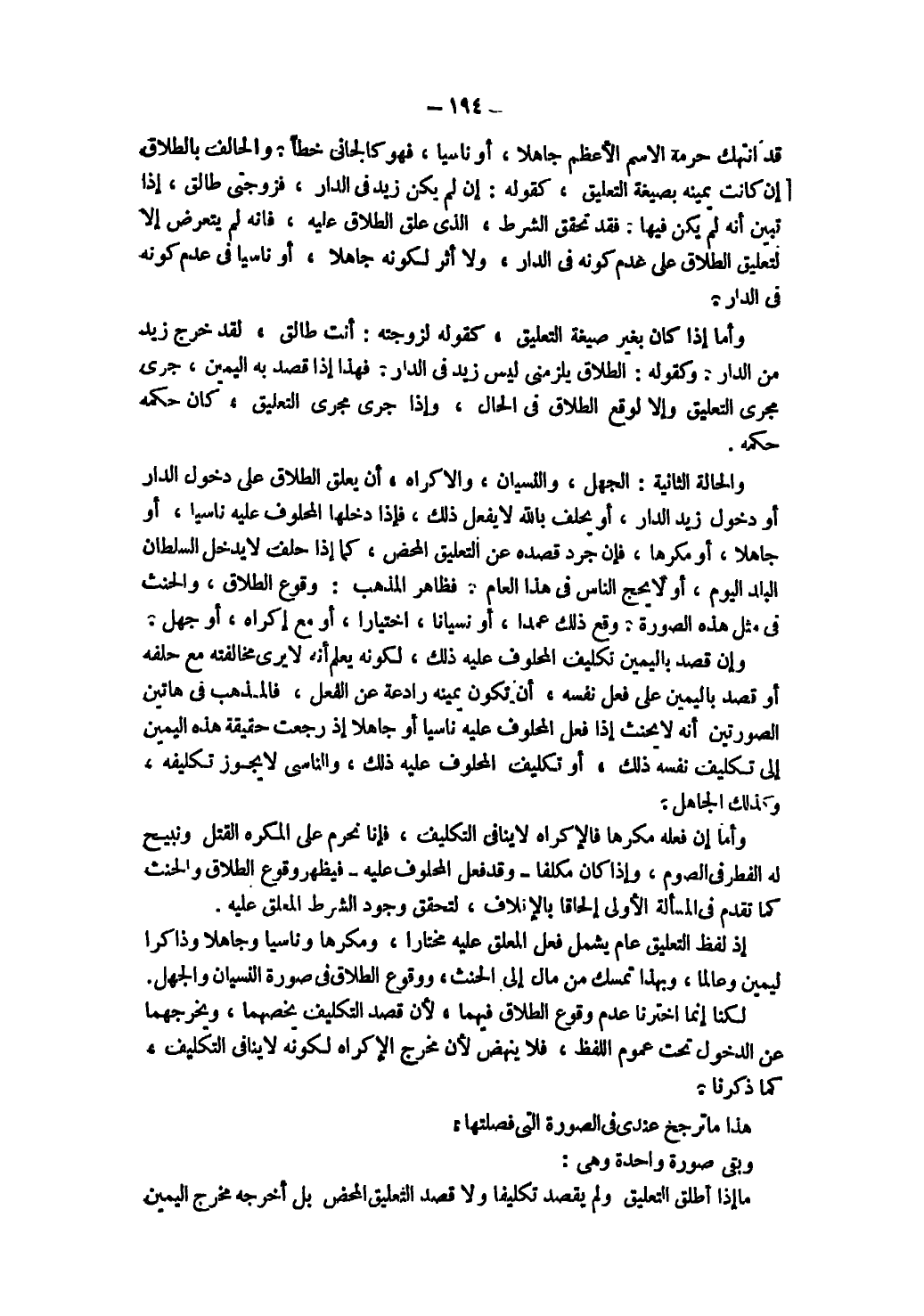 وَالْحَالَةُ الثَّانِيَةُ: الْجَهْلُ، وَالنِّسْيَانُ، وَالْإِكْرَاهُ، أَنْ يُعَلِّقَ الطَّلَاقَ عَلَى دُخُولِ الدَّارِ أَوْ دُخُولِ زَيْدٍ الدَّارَ، أَوْ يَحْلِفُ بِاَللَّهِ لَا يَفْعَلُ ذَلِكَ، فَإِذَا دَخَلَهَا الْمَحْلُوفُ عَلَيْهِ نَاسِيًا، أَوْ جَاهِلًا، أَوْ مُكْرَهًا، فَإِنْ جَرَّدَ قَصْدَهُ عَنْ التَّعْلِيقِ الْمَحْضِ، كَمَا إذَا حَلَفَ لَا يَدْخُل السُّلْطَانُ الْبَلَدَ الْيَوْمَ، أَوْ لَا يَحُجُّ النَّاسُ فِي هَذَا الْعَامِ. فَظَاهِرُ الْمَذْهَبِ: وُقُوعُ الطَّلَاقِ، وَالْحِنْثِ فِي مِثْلِ هَذِهِ الصُّورَةِ. وَقَعَ ذَلِكَ عَمْدًا، أَوْ نِسْيَانًا، اخْتِيَارًا، أَوْ مَعَ إكْرَاهٍ، أَوْ جَهْلٍ.
