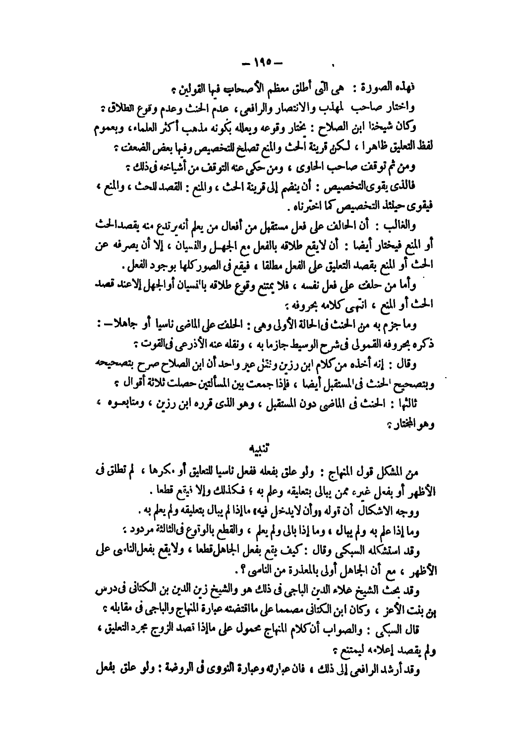 وَاخْتَارَ صَاحِبُ الْمُهَذَّبِ وَالِانْتِصَارِ وَالرَّافِعِيُّ، عَدَمَ الْحِنْث وَعَدَمَ وُقُوعِ الطَّلَاقِ.