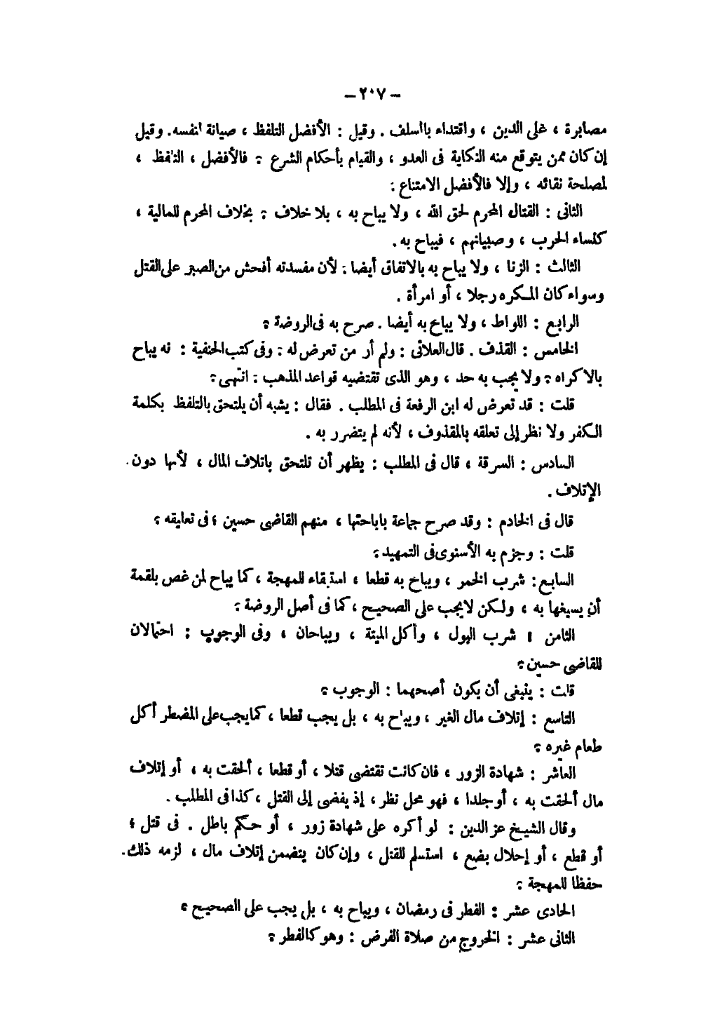 السَّابِعُ: شُرْبُ الْخَمْرِ وَيُبَاحُ بِهِ قَطْعًا اسْتِبْقَاءً لِلْمُهْجَةِ، كَمَا يُبَاحُ لِمَنْ غَصَّ بِلُقْمَةٍ أَنْ يُسِيغَهَا بِهِ، وَلَكِنْ لَا يَجِبُ عَلَى الصَّحِيحِ، كَمَا فِي أَصْلِ الرَّوْضَةِ.