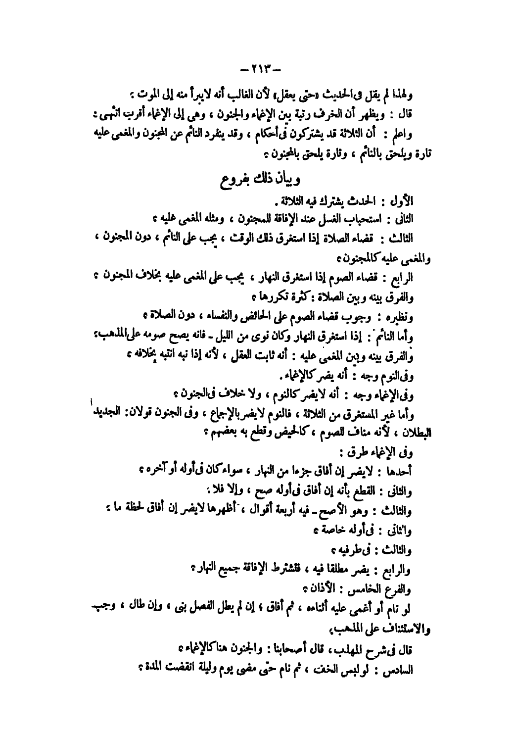 قَالَ: وَيَظْهَرُ أَنَّ الْخَرَفَ رُتْبَةٌ بَيْنَ الْإِغْمَاءِ وَالْجُنُونِ، وَهِيَ إلَى الْإِغْمَاءِ أَقْرَبُ انْتَهَى. وَاعْلَمْ: أَنَّ الثَّلَاثَةَ قَدْ يَشْتَرِكُونَ فِي أَحْكَامٍ، وَقَدْ يَنْفَرِدُ النَّائِمُ عَنْ الْمَجْنُونِ. وَالْمُغْمَى عَلَيْهِ تَارَةً يَلْحَقُ بِالنَّائِمِ، وَتَارَةً يَلْحَقُ بِالْمَجْنُونِ.