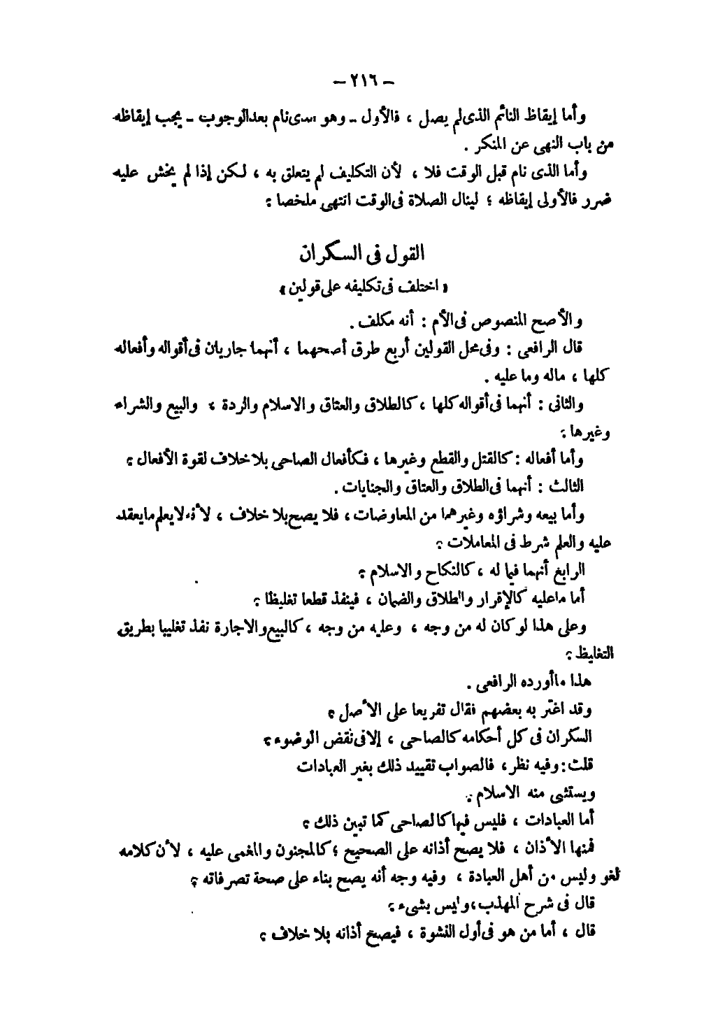 الْقَوْلُ فِي السَّكْرَانِ " اُخْتُلِفَ فِي تَكْلِيفِهِ عَلَى قَوْلَيْنِ " وَالْأَصَحُّ الْمَنْصُوصُ فِي الْأُمِّ: أَنَّهُ مُكَلَّفٌ. قَالَ الرَّافِعِيُّ: وَفِي مَحَلِّ الْقَوْلَيْنِ أَرْبَعُ طُرُقٍ أَصَحُّهَا: أَنَّهُمَا جَارِيَانِ فِي أَقْوَالِهِ وَأَفْعَالِهِ كُلِّهَا، مَا لَهُ وَمَا عَلَيْهِ.