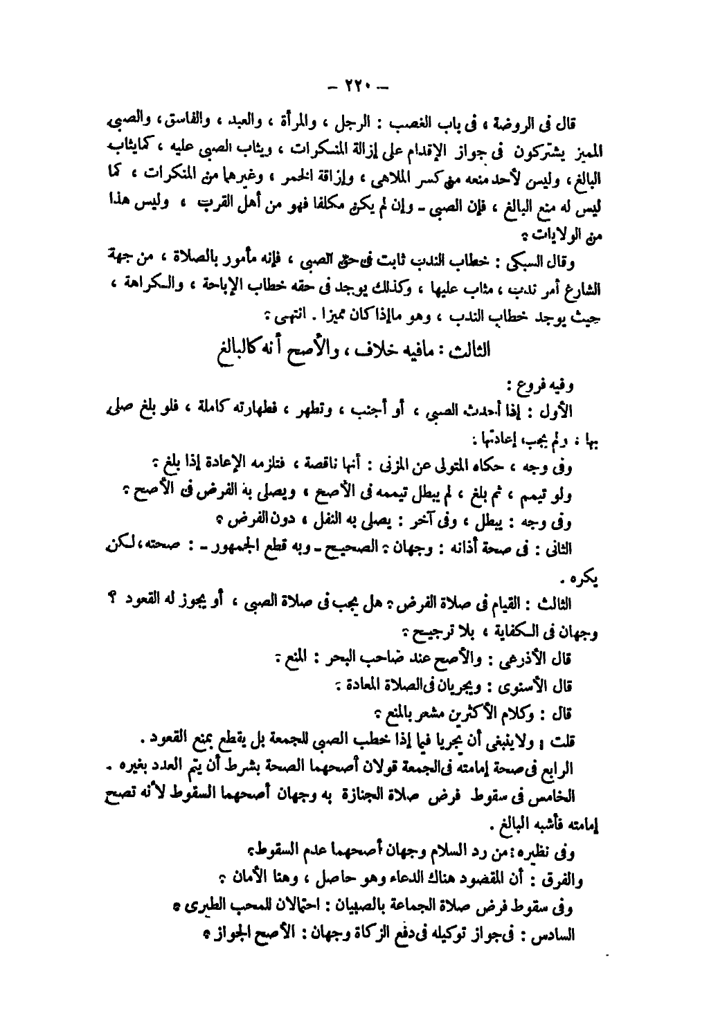 قَالَ فِي الرَّوْضَةِ، فِي بَابِ الْغَصْبِ: الرَّجُلُ، وَالْمَرْأَةُ، وَالْعَبْدُ، وَالْفَاسِقُ، وَالصَّبِيُّ الْمُمَيِّزُ يَشْتَرِكُونَ فِي جَوَازِ الْإِقْدَامِ عَلَى إزَالَةِ الْمُنْكَرَاتِ، وَيُثَابُ الصَّبِيُّ عَلَيْهِ كَمَا يُثَابُ الْبَالِغُ، وَلَيْسَ لِأَحَدٍ مَنْعُهُ مِنْ كَسْرِ الْمَلَاهِي، وَإِرَاقَةِ الْخَمْرِ، وَغَيْرِهِمَا مِنْ الْمُنْكَرَاتِ، كَمَا لَيْسَ لَهُ مَنْعُ الْبَالِغِ، فَإِنَّ الصَّبِيَّ - وَإِنْ لَمْ يَكُنْ مُكَلَّفًا - فَهُوَ مِنْ أَهْلِ الْقُرَبِ، وَلَيْسَ هَذَا مِنْ الْوِلَايَاتِ.