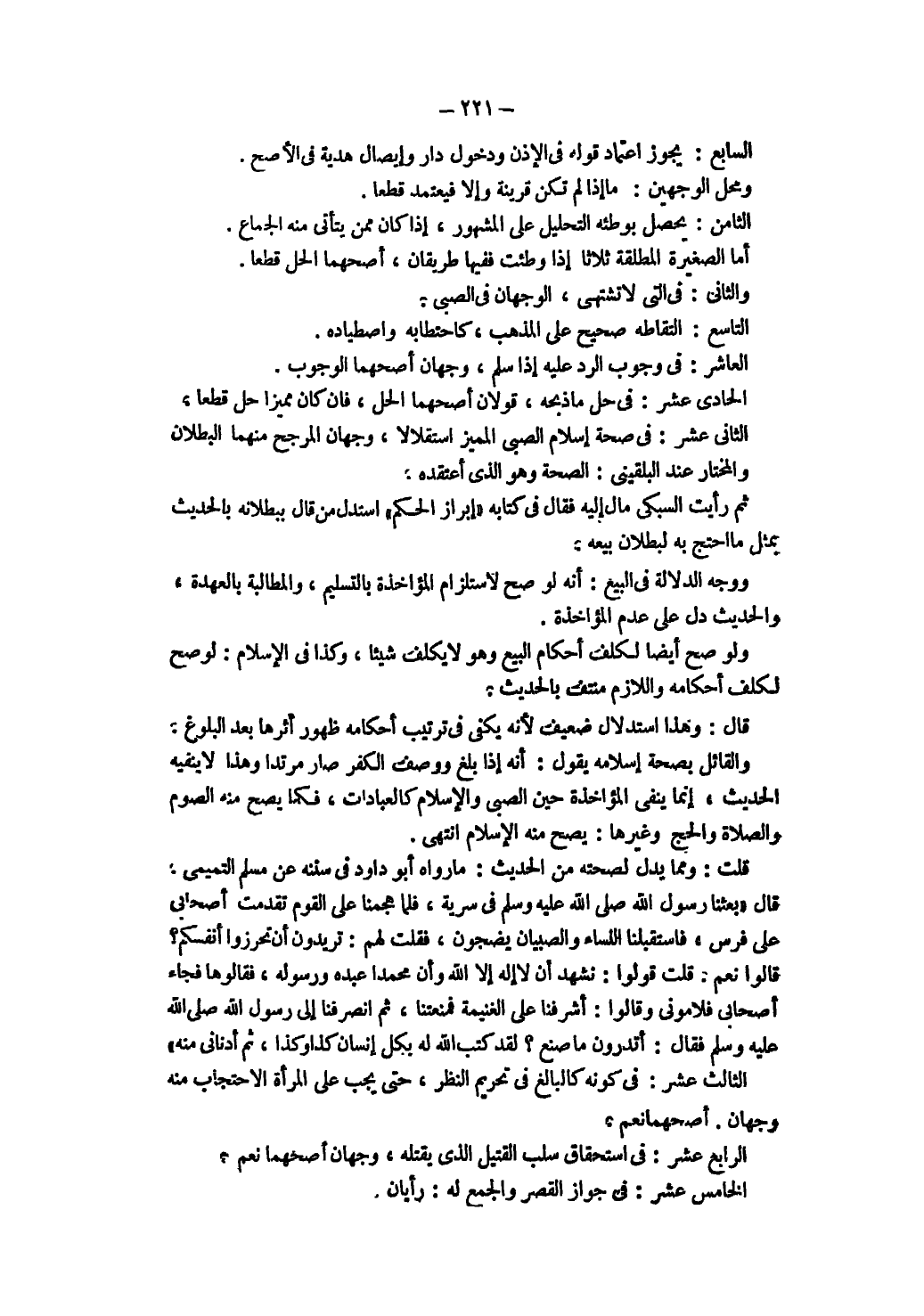 الثَّانِيَ عَشَرَ فِي صِحَّةِ إسْلَامِ الصَّبِيِّ الْمُمَيِّزِ اسْتِقْلَالًا، وَجْهَانِ الْمُرَجَّحِ مِنْهُمَا: الْبُطْلَانُ وَالْمُخْتَارُ عِنْدَ الْبُلْقِينِيِّ الصِّحَّةُ، وَهُوَ الَّذِي أَعْتَقِدُهُ، ثُمَّ رَأَيْت السُّبْكِيَّ مَالَ إلَيْهِ فَقَالَ فِي كِتَابِهِ " إبْرَازُ الْحُكْمِ ": اسْتَدَلَّ مَنْ قَالَ بِبُطْلَانِهِ بِالْحَدِيثِ بِمِثْلِ مَا اُحْتُجَّ بِهِ لِبُطْلَانِ بَيْعِهِ.