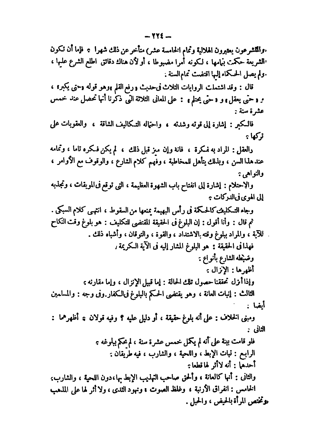 قَالَ: وَقَدْ اشْتَمَلَتْ الرِّوَايَاتُ الثَّلَاثُ فِي حَدِيثِ «رُفِعَ الْقَلَمُ» وَهُوَ قَوْلُهُ «حَتَّى يَكْبُرَ» وَ «حَتَّى يَعْقِلَ» وَ «حَتَّى يَحْتَلِمَ» : عَلَى الْمَعَانِي الثَّلَاثَةِ الَّتِي ذَكَرْنَا أَنَّهَا تَحْصُلُ عِنْدَ خَمْسَ عَشْرَةَ سَنَةً.