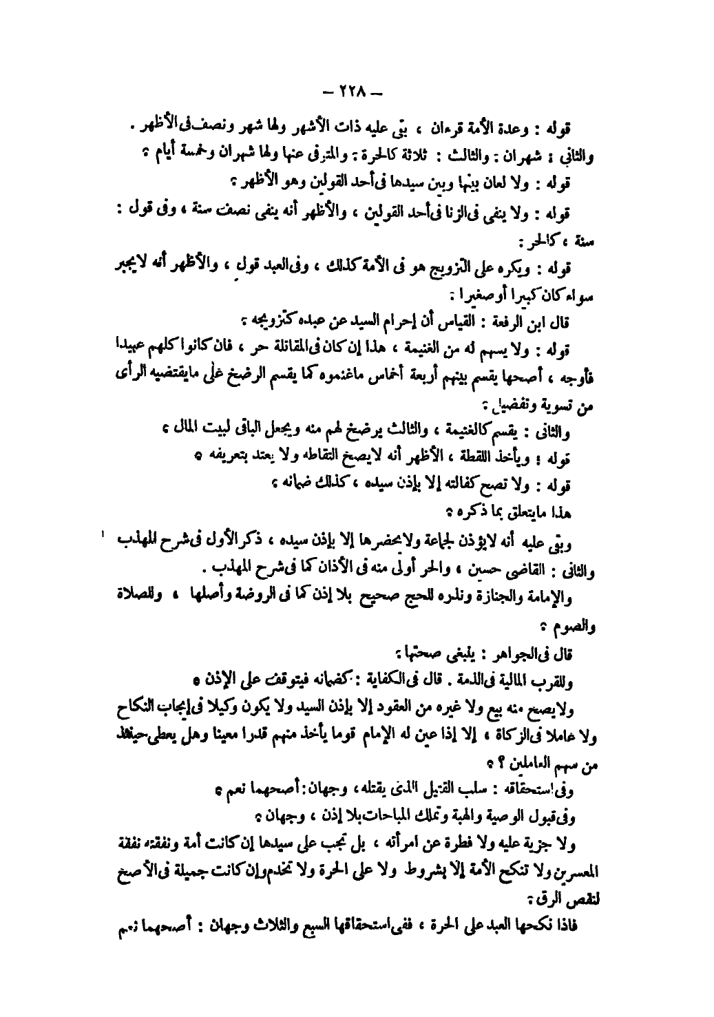 هَذَا مَا يَتَعَلَّق بِمَا ذَكَرَهُ. وَبَقِي عَلَيْهِ أَنَّهُ لَا يُؤَذِّنُ لِجَمَاعَةٍ وَلَا يَحْضُرُهَا إلَّا بِإِذْنِ سَيِّدِهِ، ذُكِرَ الْأَوَّلُ فِي شَرْحِ الْمُهَذَّبِ وَالثَّانِي: الْقَاضِي حُسَيْنٌ، وَالْحُرُّ أَوْلَى مِنْهُ فِي الْأَذَانِ كَمَا فِي شَرْحِ الْمُهَذَّبِ.