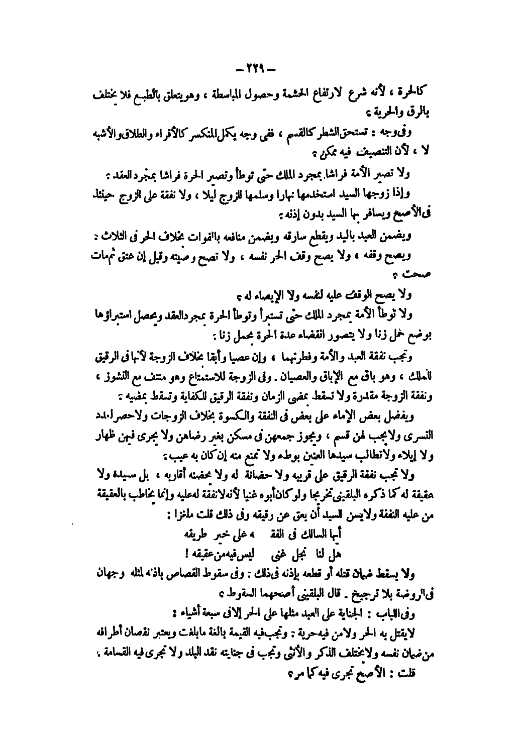 وَيُفَضَّلُ بَعْضُ الْإِمَاءِ عَلَى بَعْضٍ فِي النَّفَقَةِ وَالْكِسْوَةِ بِخِلَافِ الزَّوْجَاتِ، وَلَا حَصْرَ لِمُدَدِ التَّسَرِّي وَلَا يَجِبُ لَهُنَّ قَسْمٌ، وَيَجُوزُ جَمْعُهُنَّ فِي مَسْكَنٍ بِغَيْرِ رِضَاهُنَّ، وَلَا يَجْرِي فِيهِنَّ ظِهَارٌ وَلَا إيلَاءٌ وَلَا تُطَالِبُ سَيِّدَهَا الْعِنِّينَ بِوَطْءٍ وَلَا تُمْنَعُ مِنْهُ إنْ كَانَ بِهِ عَيْبٌ، وَلَا تَجِبُ نَفَقَةُ الرَّقِيقِ عَلَى قَرِيبِهِ، وَلَا حَضَانَةَ لَهُ وَلَا يَحْضُنُهُ أَقَارِبُهُ، بَلْ سَيِّدُهُ، وَلَا عَقِيقَةَ لَهُ كَمَا ذَكَرَهُ الْبُلْقِينِيُّ تَخْرِيجًا، وَلَوْ كَانَ أَبُوهُ غَنِيًّا ; لِأَنَّهُ لَا نَفَقَةَ لَهُ عَلَيْهِ وَإِنَّمَا يُخَاطَبُ بِالْعَقِيقَةِ مَنْ عَلَيْهِ النَّفَقَةُ وَلَا يُسَنُّ لِلسَّيِّدِ أَنْ يَعُقَّ عَنْ رَقِيقِهِ وَفِي ذَلِكَ قُلْت مُلْغِزًا: