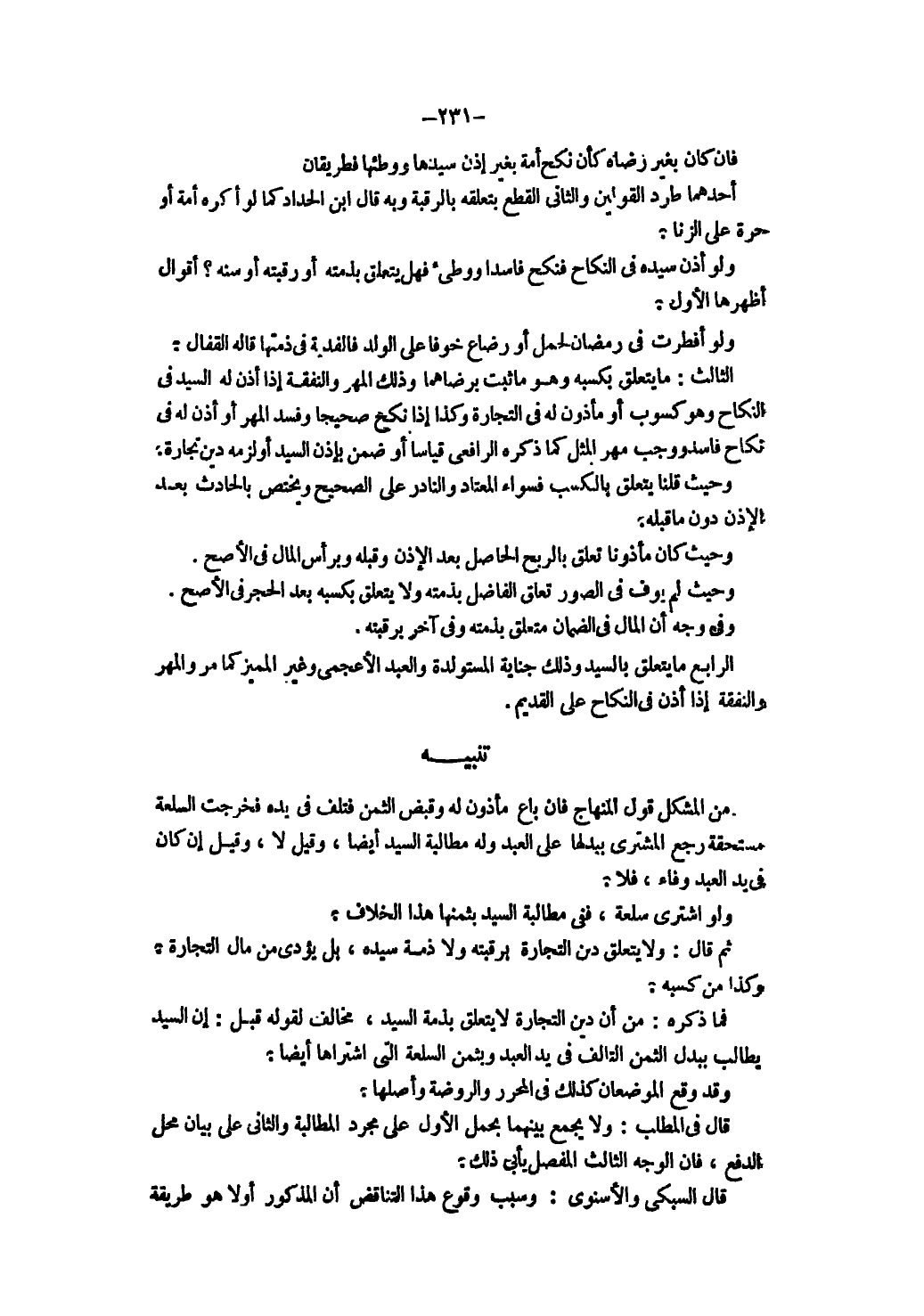مِنْ الْمُشْكِلِ قَوْلُ الْمِنْهَاجِ فَإِنْ بَاعَ مَأْذُونٌ لَهُ وَقَبَضَ الثَّمَنَ فَتَلَفَ فِي يَدِهِ فَخَرَجَتْ السِّلْعَةُ مُسْتَحَقَّةً رَجَعَ الْمُشْتَرِي بِبَدَلِهَا عَلَى الْعَبْدِ وَلَهُ مُطَالَبَةُ السَّيِّدِ أَيْضًا، وَقِيلَ: لَا، وَقِيلَ: إنْ كَانَ فِي يَد الْعَبْدِ وَفَاءٌ، فَلَا. وَلَوْ اشْتَرَى سِلْعَةً، فَفِي مُطَالَبَةِ السَّيِّدِ بِثَمَنِهَا هَذَا الْخِلَافُ، ثُمَّ قَالَ: وَلَا يَتَعَلَّقُ دَيْنُ التِّجَارَةِ بِرَقَبَتِهِ وَلَا ذِمَّةِ سَيِّدِهِ، بَلْ يُؤَدَّى مِنْ مَالِ التِّجَارَةِ. وَكَذَا مِنْ كَسْبِهِ، فَمَا ذَكَرَهُ: مِنْ أَنَّ دَيْنَ التِّجَارَةِ لَا يَتَعَلَّقُ بِذِمَّةِ السَّيِّدِ، مُخَالِفٌ لِقَوْلِهِ قَبْلُ: إنَّ السَّيِّدَ يُطَالَبُ بِبَدَلِ الثَّمَنِ التَّالِفِ فِي يَدِ الْعَبْدِ وَبِثَمَنِ السِّلْعَةِ الَّتِي اشْتَرَاهَا أَيْضًا، وَقَدْ وَقَعَ الْمَوْضِعَانِ كَذَلِكَ فِي الْمُحَرَّرِ وَالرَّوْضَةِ وَأَصْلِهَا.