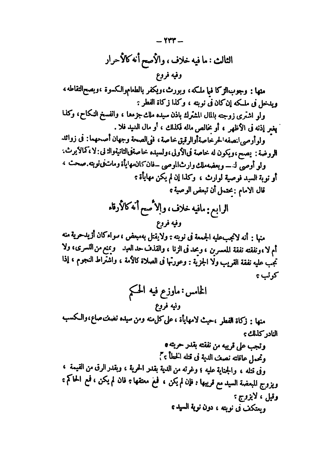 الثَّالِثُ: مَا فِيهِ خِلَافٌ، وَالْأَصَحُّ أَنَّهُ كَالْأَحْرَارِ وَفِيهِ فُرُوعٌ مِنْهَا: وُجُوبُ الزَّكَاةِ فِيمَا مَلَكَهُ، وَيُورَثُ وَيُكَفِّرُ بِالطَّعَامِ وَالْكِسْوَةِ، وَيَصِحُّ الْتِقَاطُهُ، وَيَدْخُلُ فِي مُلْكِهِ إنْ كَانَ فِي نَوْبَتِهِ، وَكَذَا زَكَاةُ الْفِطْرِ.
