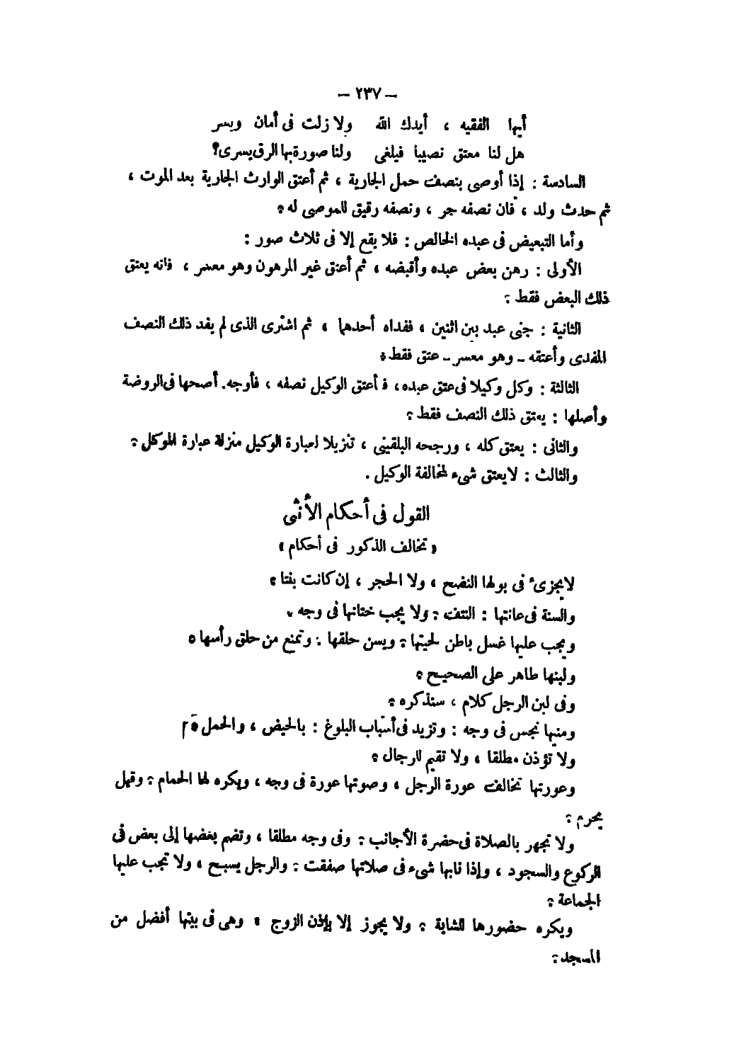 الْقَوْلُ فِي أَحْكَامِ الْأُنْثَى تُخَالِف الذُّكُور فِي أَحْكَام لَا يُجْزِئ فِي بَوْلهَا النَّضْح، وَلَا الْحَجَرُ، إنْ كَانَتْ بِنْتًا. وَالسُّنَّةُ فِي عَانَتِهَا: النَّتْفُ. وَلَا يَجِبُ خِتَانُهَا فِي وَجْهٍ. وَيَجِبُ عَلَيْهَا غُسْلُ بَاطِنِ لِحْيَتهَا. وَيُسَنُّ حَلْقُهَا. وَتُمْنَعُ مِنْ حَلْقِ رَأْسِهَا. وَلَبَنُهَا طَاهِرٌ عَلَى الصَّحِيحِ. وَفِي لَبَن الرَّجُلِ كَلَامٌ، سَنَذْكُرُهُ.