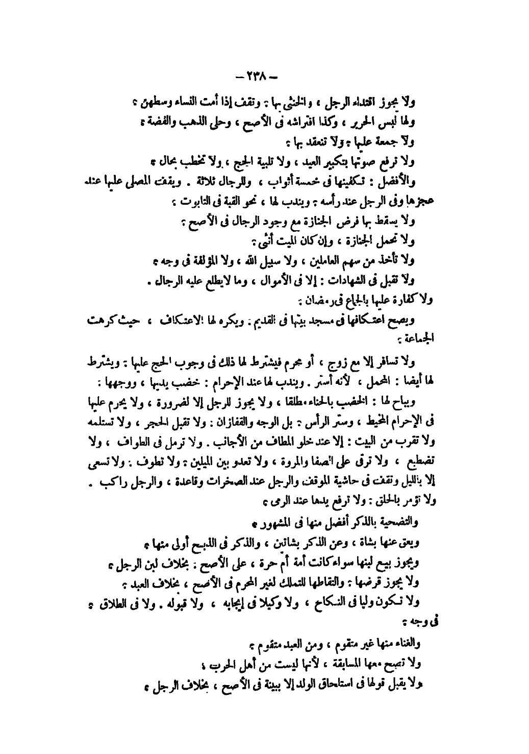 وَلَا تَرْفَعُ صَوْتَهَا بِتَكْبِيرِ الْعِيدِ، وَلَا تَلْبِيَةِ الْحَجّ، وَلَا تَخْطُبُ بِحَالٍ. وَالْأَفْضَلُ: تَكْفِينُهَا فِي خَمْسَةِ أَثْوَابٍ، وَلِلرِّجَالِ ثَلَاثَةٌ. وَيَقِف الْمُصَلِّي عَلَيْهَا عِنْدَ عَجُزِهَا وَفِي الرَّجُل عِنْدَ رَأْسِهِ. وَيُنْدَبُ لَهَا، نَحْوُ الْقُبَّةِ فِي التَّابُوتِ. وَلَا يَسْقُطُ بِهَا فَرْضُ الْجِنَازَةِ مَعَ وُجُودِ الرِّجَالِ فِي الْأَصَحِّ، وَلَا تَحْمِلُ الْجِنَازَةَ، وَإِنْ كَانَ الْمَيِّتُ أُنْثَى. وَلَا تَأْخُذُ مِنْ سَهْمِ الْعَامِلِينَ، وَلَا سَبِيلِ اللَّهِ، وَلَا الْمُؤَلَّفَةِ فِي وَجْهٍ.