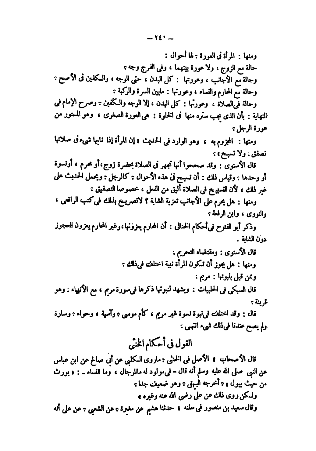 وَحَالَةٌ مَعَ الْأَجَانِبِ، وَعَوْرَتُهَا: كُلُّ الْبَدَنِ، حَتَّى الْوَجْهِ وَالْكَفَّيْنِ فِي الْأَصَحِّ. وَحَالَةٌ مَعَ الْمَحَارِمِ وَالنِّسَاءِ، وَعَوْرَتُهَا: مَا بَيْن السُّرَّةِ وَالرُّكْبَةِ. وَحَالَةٌ فِي الصَّلَاة، وَعَوْرَتُهَا: كُلُّ الْبَدَنِ، إلَّا الْوَجْهُ وَالْكَفَّيْنِ. وَصَرَّحَ الْإِمَامُ فِي النِّهَايَةِ: بِأَنَّ الَّذِي يَجِبُ سَتْرُهُ مِنْهَا فِي الْخَلْوَةِ: هِيَ الْعَوْرَةُ الصُّغْرَى، وَهُوَ الْمَسْتُورُ مِنْ عَوْرَةِ الرَّجُلِ. وَمِنْهَا: الْمَجْزُومُ بِهِ، وَهُوَ الْوَارِدُ فِي الْحَدِيثِ: " «إنَّ الْمَرْأَةَ إذَا نَابَهَا شَيْءٌ فِي صَلَاتِهَا تُصَفِّقُ. وَلَا تُسَبِّحُ» قَالَ الْإِسْنَوِيُّ: وَقَدْ صَحَّحُوا أَنَّهَا تَجْهَرُ فِي الصَّلَاةِ بِحَضْرَةِ زَوْجٍ، أَوْ مُحْرِمٍ، أَوْ نِسْوَةٍ أَوْ وَحْدَهَا: وَقِيَاسُ ذَلِكَ: أَنْ تُسَبِّحَ فِي هَذِهِ الْأَحْوَالِ. كَالرَّجُلِ. وَيُحْمَل الْحَدِيثُ عَلَى غَيْرِ ذَلِكَ، لِأَنَّ التَّسْبِيحَ فِي الصَّلَاةِ أَلْيَقُ مِنْ الْفِعْلِ، خُصُوصًا التَّصْفِيقُ. وَمِنْهَا: هَلْ يُحَرَّمُ عَلَى الْأَجَانِبِ تَعْزِيَةِ الشَّابَّةِ؟ لَا تَصْرِيحَ بِذَلِكَ فِي كُتُبِ الرَّافِعِيِّ، وَالنَّوَوِيِّ، وَابْنِ الرِّفْعَةِ. وَذَكَرَ أَبُو الْفُتُوحِ فِي أَحْكَامِ الْخَنَاثَى: أَنَّ الْمَحَارِمَ يُعَزُّونَهَا، وَغَيْرَ الْمَحَارِمِ يُعَزُّونَ الْعَجُوزَ دُونَ الشَّابَّةِ. قَالَ الْإِسْنَوِيُّ: وَمُقْتَضَاهُ التَّحْرِيمُ.