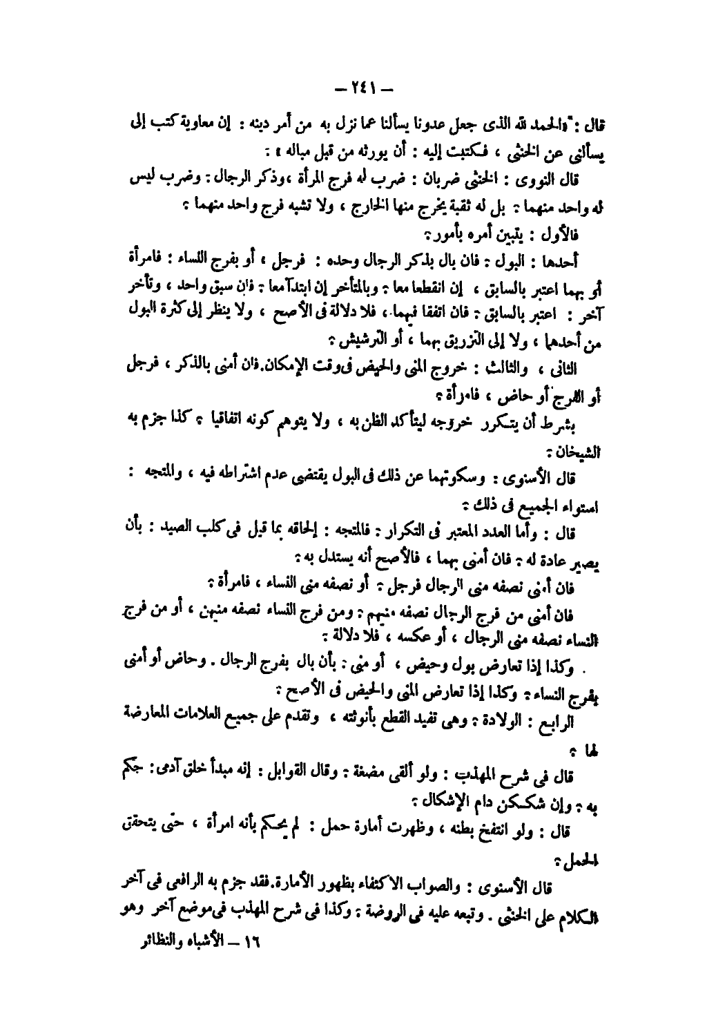 وَالْمُتَّجَهُ: اسْتِوَاءُ الْجَمِيعِ فِي ذَلِكَ قَالَ: وَأَمَّا الْعَدَدُ الْمُعْتَبَرُ فِي التَّكْرَارِ. فَالْمُتَّجَهُ: إلْحَاقُهُ بِمَا قِيلَ فِي كَلْبِ الصَّيْدِ: بِأَنْ يَصِيرَ عَادَةً لَهُ. فَإِنْ أَمْنَى بِهِمَا، فَالْأَصَحُّ أَنَّهُ يُسْتَدَلُّ بِهِ، فَإِنْ أَمْنَى نِصْفَهُ مَنِيَّ الرِّجَالِ فَرَجُلٌ، أَوْ نِصْفُهُ مَنِيُّ النِّسَاء، فَامْرَأَةٌ، فَإِنْ أَمْنَى مِنْ فَرْجِ الرِّجَال نِصْفُهُ مَنِيُّهُمْ. وَمِنْ فَرْجِ النِّسَاءِ نِصْفُهُ مَنِيُّهُنَّ، أَوْ مِنْ فَرْجِ النِّسَاءِ نِصْفُهُ مَنِيّ الرِّجَالِ، أَوْ عَكْسُهُ، فَلَا دَلَالَةَ، وَكَذَا إذَا تَعَارَضَ بَوْلٌ وَحَيْضٌ، أَوْ مَنِيٌّ. بِأَنْ بَالَ بِفَرْجِ الرِّجَالِ، وَحَاضَ أَوْ أَمْنَى بِفَرْجِ النِّسَاءِ. وَكَذَا إذَا تَعَارَضَ الْمَنِيُّ وَالْحَيْضُ فِي الْأَصَحِّ.