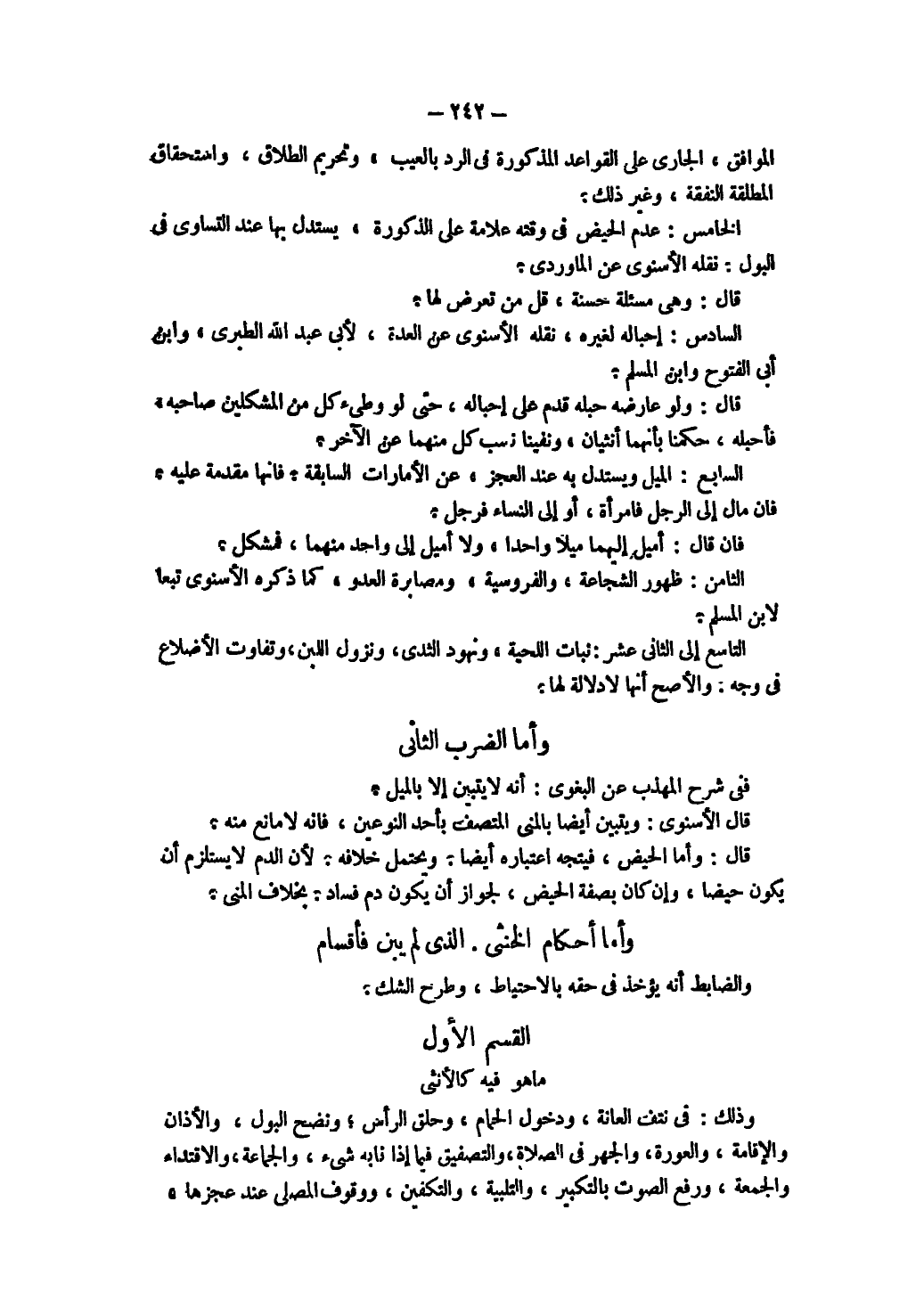وَأَمَّا أَحْكَامُ الْخُنْثَى الَّذِي لَمْ يَبِنْ فَأَقْسَامٌ وَالضَّابِطُ أَنَّهُ يُؤْخَذُ فِي حَقِّهِ بِالِاحْتِيَاطِ، وَطَرْح الشَّكِّ. الْقِسْمُ الْأَوَّلُ: مَا هُوَ فِيهِ كَالْأُنْثَى ذَلِكَ فِي نَتْفِ الْعَانَةِ، وَدُخُولِ الْحَمَّامِ، وَحَلْقِ الرَّأْسِ ; وَنَضْحِ الْبَوْلِ، وَالْأَذَانِ وَالْإِقَامَةِ، وَالْعَوْرَةِ، وَالْجَهْرِ فِي الصَّلَاةِ، وَالتَّصْفِيقِ فِيمَا إذَا نَابَهُ شَيْءٌ، وَالْجَمَاعَةِ، وَالِاقْتِدَاءِ وَالْجُمُعَةِ، وَرَفْعِ الصَّوْتِ بِالتَّكْبِيرِ، وَالتَّلْبِيَةِ، وَالتَّكْفِينِ، وَوُقُوفِ الْمُصَلِّي عِنْدَ عَجُزِهَا.