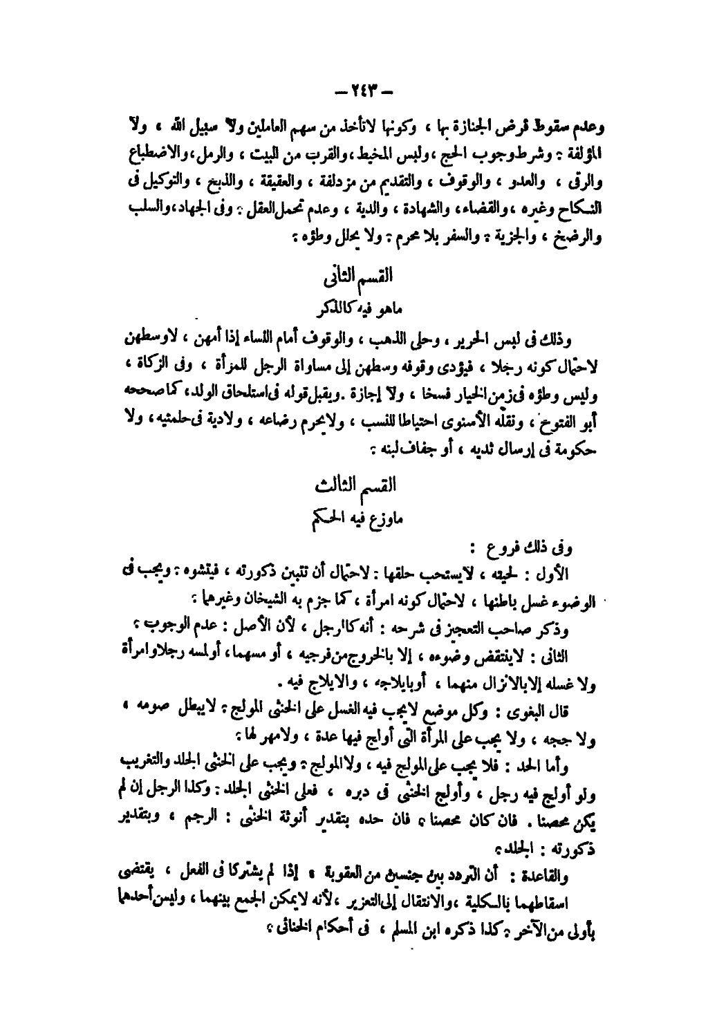 الْقِسْمُ الثَّانِي: مَا هُوَ فِيهِ كَالذَّكَرِ وَذَلِكَ فِي لُبْسِ الْحَرِيرِ، وَحُلِيِّ الذَّهَبِ، وَالْوُقُوفِ أَمَامِ النِّسَاءِ إذَا أَمَّهُنَّ، لَا أَوْسَطَهُنَّ لِاحْتِمَالِ كَوْنِهِ رَجُلًا، فَيُؤَدِّي وُقُوفُهُ وَسَطَهُنَّ إلَى مُسَاوَاةِ الرَّجُلِ لِلْمَرْأَةِ، وَفِي الزَّكَاةِ، وَلَيْسَ وَطْؤُهُ فِي زَمَنِ الْخِيَارِ فَسْخًا، وَلَا إجَازَةً. وَيُقْبَلُ قَوْلُهُ فِي اسْتِلْحَاقِ الْوَلَدِ، كَمَا صَحَّحَهُ أَبُو الْفُتُوحِ، وَنَقَلَهُ الْإِسْنَوِيُّ احْتِيَاطًا لِلنَّسَبِ، وَلَا يَحْرُمُ رَضَاعُهُ، وَلَا دِيَةَ فِي حَلَمَتِهِ، وَلَا حُكُومَةَ فِي إرْسَالِ ثَدْيِهِ، أَوْ جَفَافِ لَبَنِهِ.
