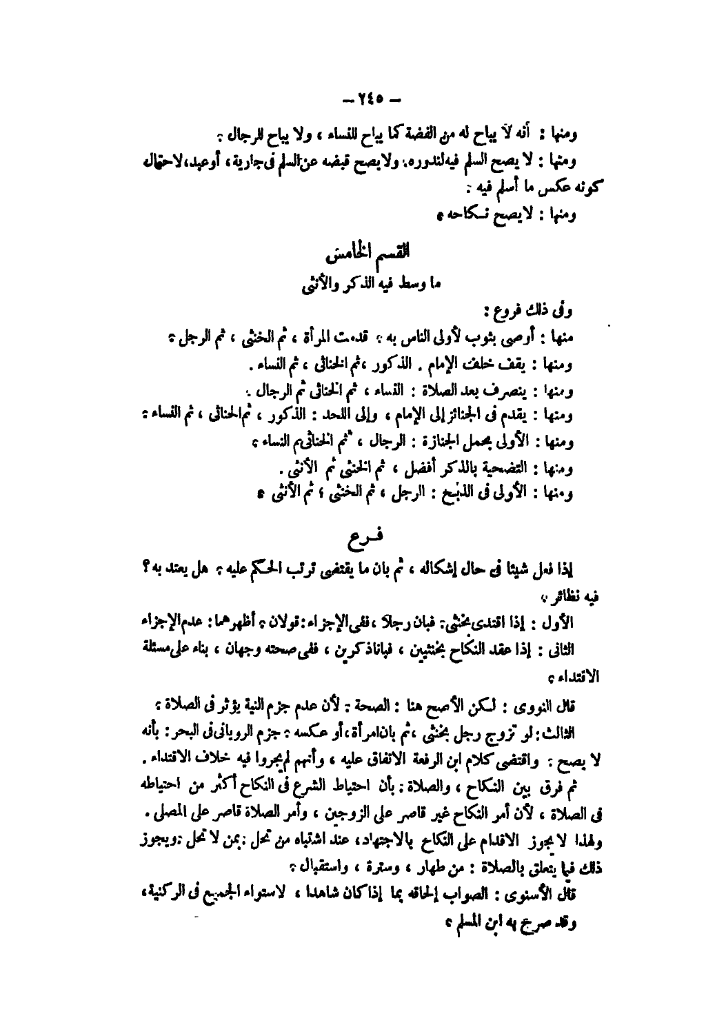 الْقِسْمُ الْخَامِسُ: مَا وَسَطَ فِيهِ الذَّكَرُ وَالْأُنْثَى وَفِي ذَلِكَ فُرُوعٌ: مِنْهَا: أَوْصَى بِثَوْبٍ لِأَوْلَى النَّاسِ بِهِ، قُدِّمَتْ الْمَرْأَةُ، ثُمَّ الْخُنْثَى، ثُمَّ الرَّجُلُ. وَمِنْهَا يَقِفُ خَلْفَ الْإِمَامِ. الذُّكُورُ، ثُمَّ الْخَنَاثَى، ثُمَّ النِّسَاءُ. وَمِنْهَا: يَنْصَرِفُ بَعْدَ الصَّلَاةِ: النِّسَاءُ، ثُمَّ الْخَنَاثَى ثُمَّ الرِّجَالُ. وَمِنْهَا يُقَدَّمُ فِي الْجَنَائِزِ: إلَى الْأَمَامِ وَإِلَى اللَّحْدِ الذُّكُورُ ثُمَّ الْخَنَاثَى ثُمَّ النِّسَاءُ وَمِنْهَا الْأَوْلَى بِحَمْلِ الْجِنَازَةِ الرِّجَالُ، ثُمَّ الْخَنَاثَى ثُمَّ النِّسَاءُ -