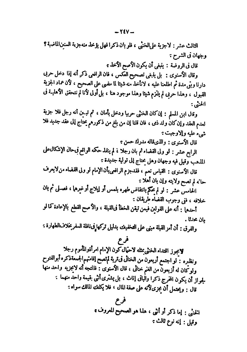 الثَّالِثَ عَشَرَ: لَا جِزْيَةَ عَلَى الْخُنْثَى، فَلَوْ بَانَ ذَكَرًا فَهَلْ يُؤْخَذُ مِنْهُ جِزْيَةُ السِّنِينَ الْمَاضِيَةِ؟ وَجْهَانِ فِي الشَّرْحِ. قَالَ فِي الرَّوْضَةِ: يَنْبَغِي أَنْ يَكُونَ الْأَصَحُّ الْأَخْذَ.