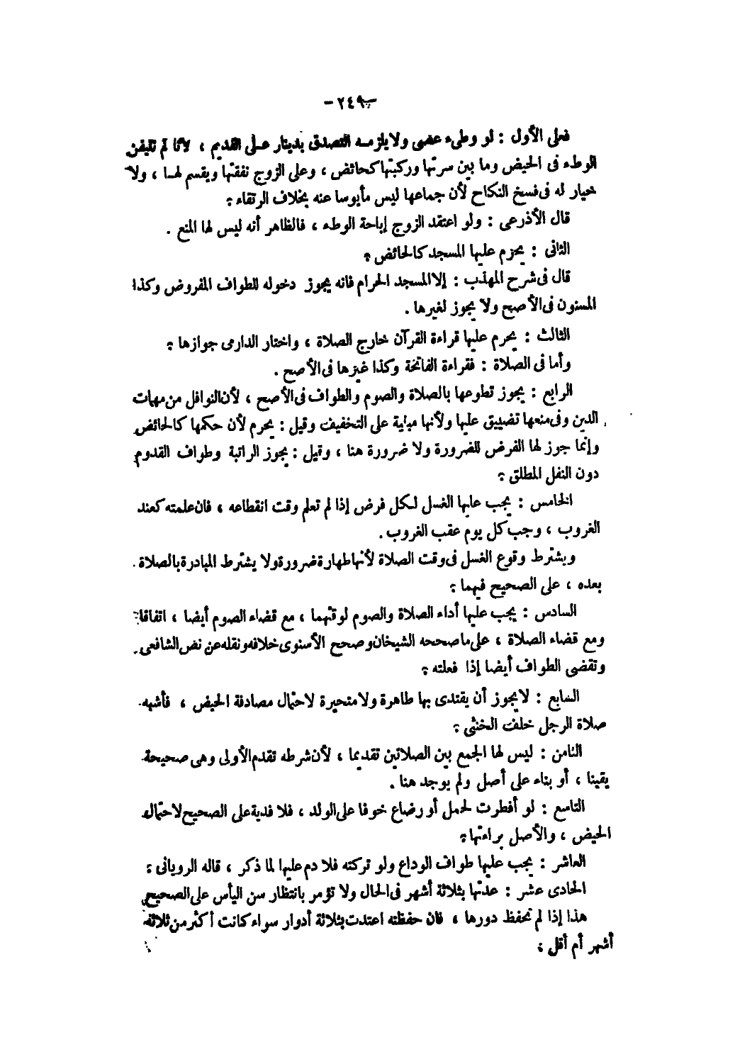 السَّادِسُ: يَجِبُ عَلَيْهَا أَدَاءُ الصَّلَاةِ وَالصَّوْمِ لِوَقْتِهِمَا، مَعَ قَضَاءِ الصَّوْمِ أَيْضًا، اتِّفَاقًا وَمَعَ قَضَاءِ الصَّلَاةِ، عَلَى مَا صَحَّحَهُ الشَّيْخَانِ وَصَحَّحَ الْإِسْنَوِيُّ خِلَافَهُ وَنَقَلَهُ عَنْ نَصِّ الشَّافِعِيِّ وَتَقْضِي الطَّوَاف أَيْضًا إذَا فَعَلَتْهُ.